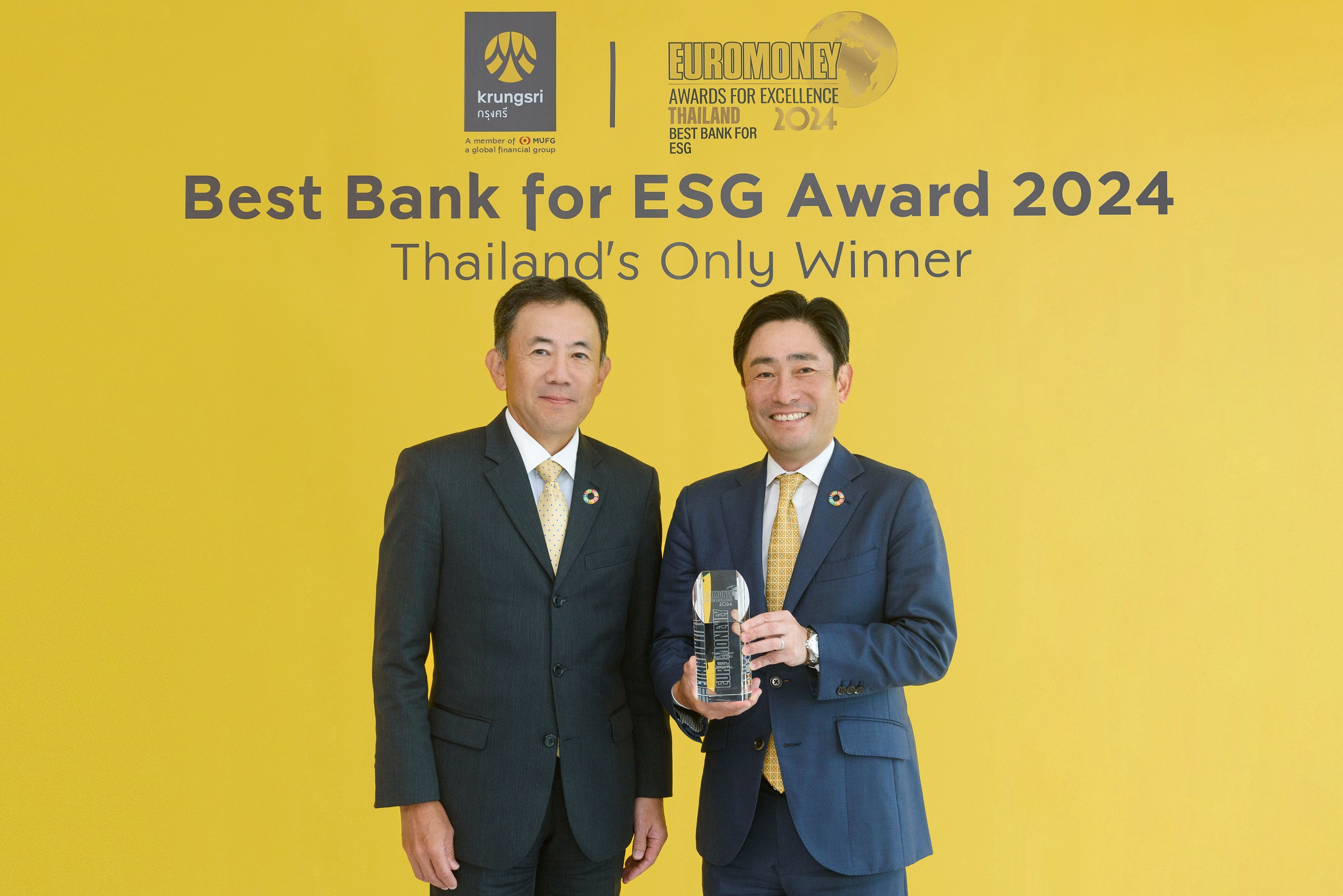 ธนาคารกรุงศรีอยุธยา จำกัด (มหาชน) นำโดย นายโนริอากิ โกโตะ (ซ้าย) ประธานกรรมการ และ นายเคนอิจิ ยามาโตะ (ขวา) กรรมการผู้จัดการใหญ่และประธานเจ้าหน้าที่บริหาร ฉลองความสำเร็จคว้ารางวัลยอดเยี่ยมด้าน ESG ในประเทศไทย (Thailand’s Best Bank for ESG) โดยเป็นรางวัลที่มอบเป็นครั้งแรกในงาน Euromoney’s Awards for Excellence 2024 จัดโดยนิตยสาร Euromoney ซึ่งเป็นหนึ่งในนิตยสารที่ทรงอิทธิพลระดับโลก ส่งผลให้กรุงศรียืนหนึ่งเป็นธนาคารแห่งแรกและแห่งเดียวในประเทศไทยที่ได้รับรางวัลอันทรงเกียรตินี้ ตอกย้ำปณิธานของกรุงศรีในการเป็นธนาคารพาณิชย์ที่ยั่งยืนที่สุดในประเทศไทย