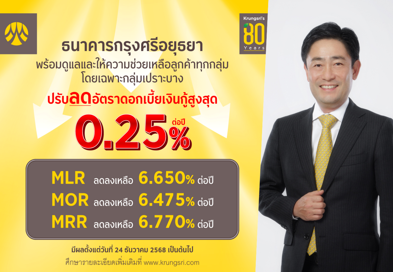 ธนาคารกรุงศรีอยุธยา จำกัด (มหาชน)) ประกาศปรับลดอัตราดอกเบี้ยเงินกู้สูงสุด 0.25% ต่อปี โดยมีผลตั้งแต่วันที่ 24 ธันวาคม 2568 เพื่อช่วยเหลือลูกค้าและลดภาระทางการเงินของลูกค้าทั้งภาคธุรกิจและรายย่อย สอดคล้องกับการปรับลดอัตราดอกเบี้ยนโยบายของคณะกรรมการ นโยบายการเงิน (กนง.) ครั้งล่าสุด