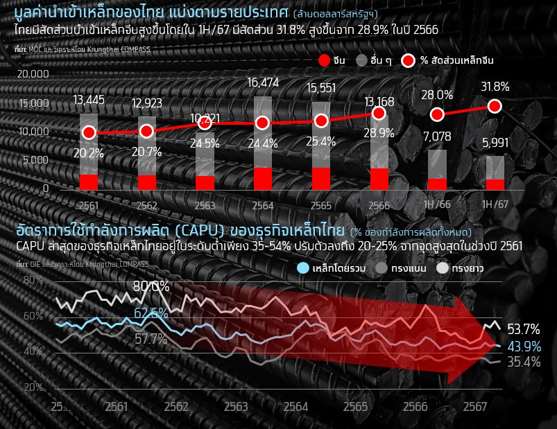 นอกจากปัญหาความต้องการบริโภคเหล็กที่ลดลงแล้ว ผู้ประกอบธุรกิจของเหล็กไทยยังต้องเผชิญกับภาวะการณ์แข่งขันที่รุนแรงขึ้นจากเหล็กนำเข้า สะท้อนจากสัดส่วนเหล็กนำเข้าต่อการบริโภคที่เพิ่มขึ้นจาก 65.6% ในปี 2562 เป็น 69.0% ใน 1H/67 โดยเมื่อแยกตามผลิตภัณฑ์พบว่าเหล็กทรงแบนมีสัดส่วนการนำเข้าเพิ่มขึ้นถึง 6.1% จาก 77.3% ในปี 2562 เป็น 83.4% ใน 1H/67 ส่วนทรงยาวเพิ่มขึ้น 3.9% จาก 40.8% เป็น 44.7% ในช่วงเดียวกัน