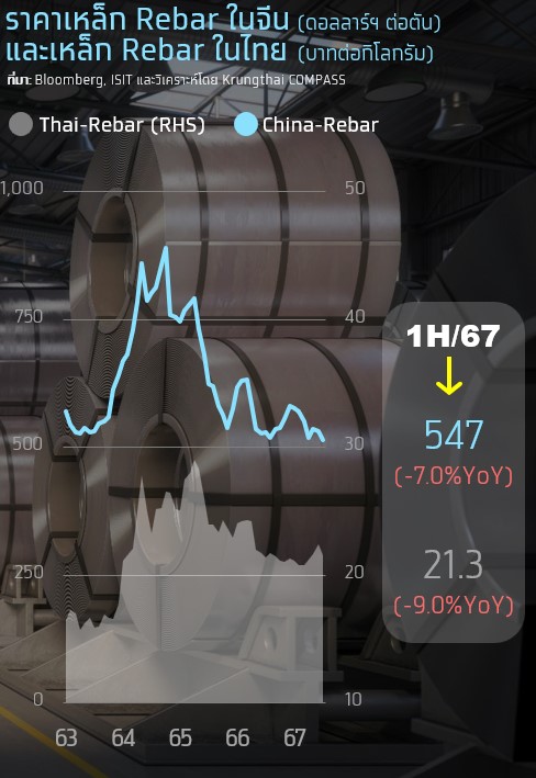 สำหรับราคาเหล็กไทยใน 1H/67 พบว่าอยู่ที่ระดับ 21.3-25.2 บาทต่อกิโลกรัม หดตัวในกรอบ -9%YoY ถึง -7%YoY โดยเป็นการปรับตัวลงตามทิศทางราคาเหล็กจีน เป็นที่ทราบกันว่าราคาเหล็กไทยมีการเคลื่อนไหวไปในทิศทางเดียวกันราคาเหล็กจีน ซึ่งตั้งแต่ต้นปี 2567 ราคาเหล็กจีนอยู่ในขาลงต่อเนื่อง โดยถูกกดดันจากภาวะตลาดอสังหาฯ ในจีนซึ่งมีสัดส่วนการใช้เหล็กถึง 1 ใน 3 อยู่ในภาวะที่ไม่สู้ดีนักสะท้อนจากภาวะการลงทุนในตลาดอสังหาฯ ของจีนที่หดตัว -10.1%YoY ใน 1H/67 รวมถึงยอดขายอสังหาฯ และพื้นที่เริ่มก่อสร้างใหม่ที่ต่างหดตัว -19.0%YoY และ -23.7%YoY กดดันให้ราคาเหล็กจีนปรับตัวลงในกรอบ -9.5%YoY ถึง -7.0%YoY มาที่ 539-547 ดอลลาร์สหรัฐฯ ต่อตัน ซึ่งเมื่อประกอบกับการใช้เหล็กในไทยที่หดตัวตามภาวะอุตสาหกรรมปลายน้ำทั้งยานยนต์และก่อสร้างจึงส่งผลต่อเนื่องให้ราคาเหล็กในไทยยังอยู่ในทิศทางเทรนด์ขาลงต่อเนื่อง