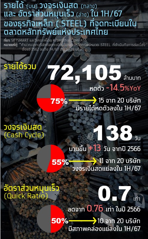 สภาพคล่อง: ผู้ประกอบธุรกิจเหล็กมีความเสี่ยงด้านสภาพคล่องสูงขึ้น สะท้อนจาก “Cash Cycle” ที่ยาวขึ้น และ “Quick Ratio” ที่แย่ลง โดยธุรกิจเหล็กในตลาดหลักทรัพย์มีวงจรเงินสดนานขึ้นจาก 125 วันในปี 2566 เป็น 138 วันในปี 1H/67 ซึ่งหมายความว่าผู้ประกอบการต้องใช้เวลานานขึ้นกว่าจะได้รับเงินสดมาใช้ในรอบถัดไป โดยเป็นผลทั้งจากระยะเวลาขายและการเก็บหนี้ที่นานขึ้น นอกจากนี้ ปัญหาสภาพคล่องของกลุ่มเหล็กยังสะท้อนจากอัตราส่วนหมุนเร็วโดยเฉลี่ยที่ลดลงจาก 0.76 เท่า เหลือ 0.7 เท่า ด้วยเช่นกัน ทั้งนี้ ผู้ประกอบการราว 50-55% หรือ 10-11 บริษัทในหมวด.STEEL นั้นต่างมีปัญหาวงจรเงินสดที่นานขึ้น และ/หรืออัตราส่วนหมุนเร็วที่แย่ลง