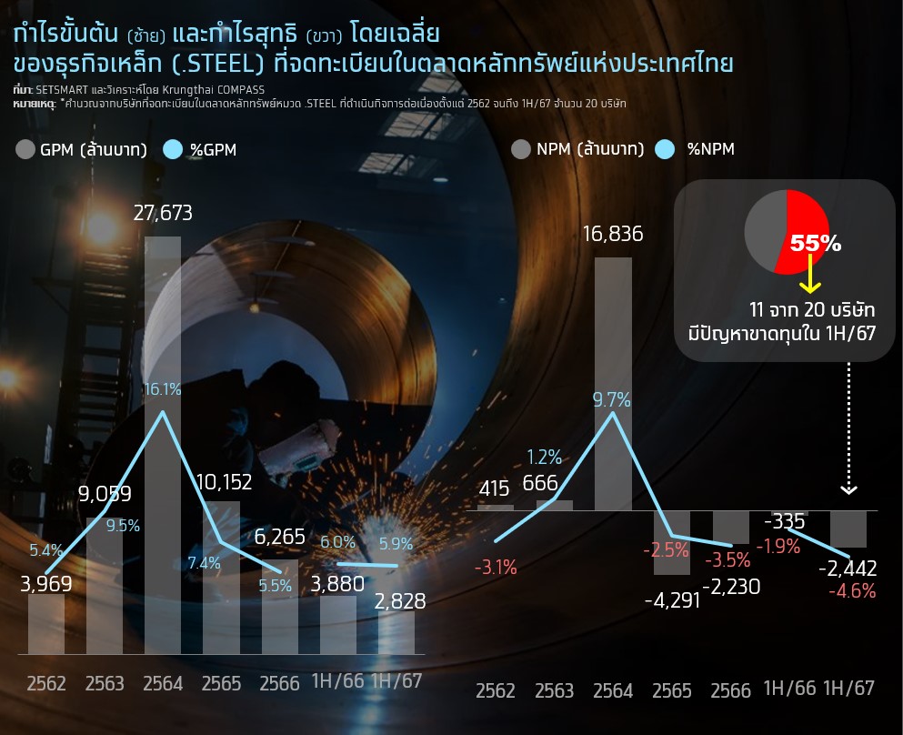 นอกจากนี้ Krungthai COMPASS พบว่า 55% ของผู้ประกอบการ ซึ่งคิดเป็นจำนวน 11 บริษัทในหมวด .STELL ต่างประสบปัญหาขาดทุนสุทธิใน 1H/67 โดยบริษัทที่ขาดทุนมากสุดนั้นมีอัตรากำไรสุทธิติดลบหนักถึง -86.5%