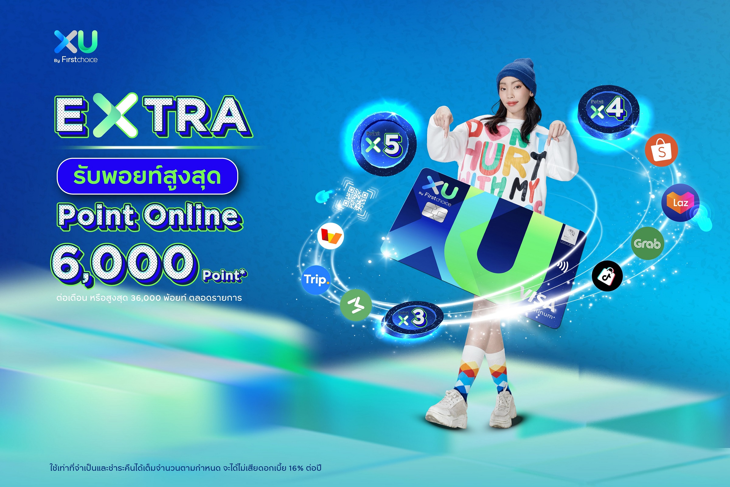 เอ็กซ์ยู บัตรเครดิต ดิจิทัล ตอบโจทย์การใช้จ่ายของคนรุ่นใหม่กับทุกไลฟ์สไตล์ #ลองป่ะ ตั้งแต่ 5 กรกฎาคม 2567–31 ธันวาคม 2567 เมื่อใช้จ่ายออนไลน์ผ่านเว็บไซต์, แอปพลิเคชัน, E-Wallet อาทิ Shopee, Lazada, Grab, Tiktok Shop, Line Man และหมวดสินค้าที่ร่วมรายการ รับความคุ้ม 2 ต่อ ต่อที่ 1: รับคะแนนสะสมเพิ่ม สูงสุด 6,000 คะแนน/เดือน เมื่อสะสมยอดใช้จ่ายออนไลน์ผ่านบัตรเครดิตต่อเดือนครบตามเงื่อนไข ต่อที่ 2 : แลกคะแนนเพื่อรับเครดิตเงินคืนสูงสุด 18% เมื่อมียอดใช้จ่ายตั้งแต่ 2,000 บาทขึ้นไป/เซลล์สลิป (เงื่อนไขเป็นไปตามที่บริษัทกำหนด) ลงทะเบียนรับสิทธิ์ผ่านแอปพลิเคชัน UCHOOSE