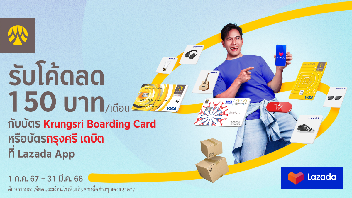 กรุงศรี (ธนาคารกรุงศรีอยุธยา จำกัด (มหาชน)) มอบสิทธิพิเศษสำหรับลูกค้าบัตร Krungsri Boarding Card หรือบัตรกรุงศรี เดบิต ทุกประเภท (รวมถึงบัตรกรุงศรี เดบิต ที่เป็นบัตรประจำตัวนักศึกษา บัตรอาจารย์ บัตรบุคลากร และบัตรพนักงาน) เมื่อช้อปที่ Lazada App และชำระค่าสินค้าหรือบริการผ่านบัตร Krungsri Boarding Card หรือบัตรกรุงศรี เดบิต รับโค้ดส่วนลดสูงสุด 150 บาทต่อเดือน ตั้งแต่วันที่ 1 กรกฎาคม 2567–31 มีนาคม 2568 โดยมีรายละเอียดดังนี้