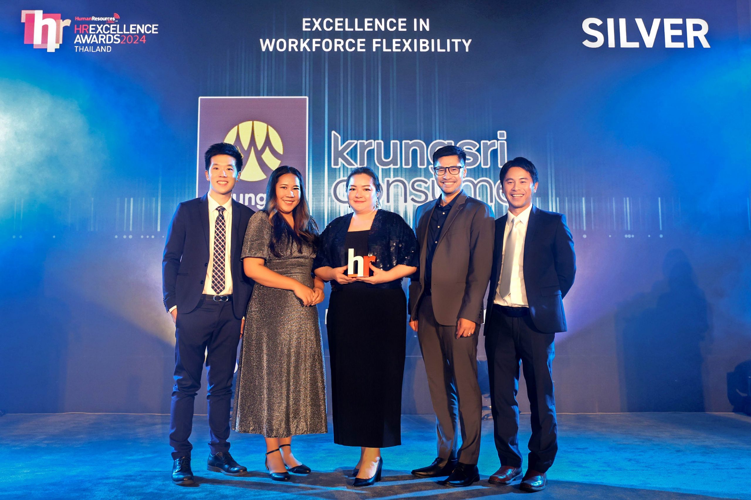 อุณา วัชโรบล (กลาง) ผู้ช่วยกรรมการผู้จัดการใหญ่ สายงานทรัพยากรบุคคล กรุงศรี คอนซูมเมอร์ รับรางวัล Excellence in Workforce Flexibility ระดับ ‘Silver’ จากเวที HR Excellence Awards 2024 ที่จัดขึ้นโดยนิตยสาร Human Resources Magazine Online เมื่อเร็วๆ นี้ ณ โรงแรมแชงกรีลา กรุงเทพฯ จากผลงานที่โดดเด่นของกรุงศรี คอนซูมเมอร์ ในการดำเนินนโยบายขับเคลื่อนการทำงานในรูปแบบ Hybrid Working สร้างวัฒนธรรมการงานแบบ Fully Remote Working ควบคู่กับระบบซัพพอร์ตต่างๆ ในการเพิ่มความยืดหยุ่นในการทำงานด้วยการทำความเข้าใจในมิติความต้องการที่หลากหลาย เคารพในความแตกต่าง เพื่อสร้างสุขภาวะความเป็นอยู่ที่ดีของพนักงาน