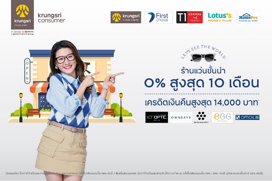 กรุงศรี คอนซูมเมอร์ จัดโปรโมชันดูแลสุขภาพสายตาสำหรับสมาชิกบัตรเครดิต กรุงศรี, บัตรกรุงศรีเฟิร์สช้อยส์, บัตรเครดิตเซ็นทรัล เดอะวัน และบัตรเครดิตโลตัส ตั้งแต่ 1 กันยายน 2567–31 ธันวาคม 2567 เมื่อรูดซื้อแว่นตาที่ร้านแบรนด์ดังชั้นนำที่ร่วมรายการ อาทิ KT OPTIC, OPTICAL 88, eGG, OWNDAYS และ SEVEN DAYS OPTIC รับสิทธิ์ผ่อน 0% นานสูงสุด 10 เดือน พร้อมรับเครดิตเงินคืนสูงสุด 14,000 บาท เมื่อลงทะเบียนก่อนทำรายการ และยังสามารถใช้คะแนนสะสมแลกรับเครดิตเงินคืนเพิ่ม 15% เมื่อมียอดผ่อนชำระตั้งแต่ 3,000 บาทขึ้นไป/เซลล์สลิป (เงื่อนไขเป็นไปตามที่บริษัทกำหนด) ข้อมูลเพิ่มเติม https://bit.ly/prkit-optic ทั้งนี้ บัตรเครดิต : ใช้เท่าที่จำเป็นและชำระคืนได้เต็มจำนวนตามกำหนด จะได้ไม่เสียดอกเบี้ย 16% ต่อปี/สินเชื่อส่วนบุคคล:กู้เท่าที่จำเป็นและชำระคืนได้ตามกำหนด จะได้ไม่เสียดอกเบี้ย 15%-25% ต่อปี (อัตราดอกเบี้ยปกติ 25% ต่อปี)