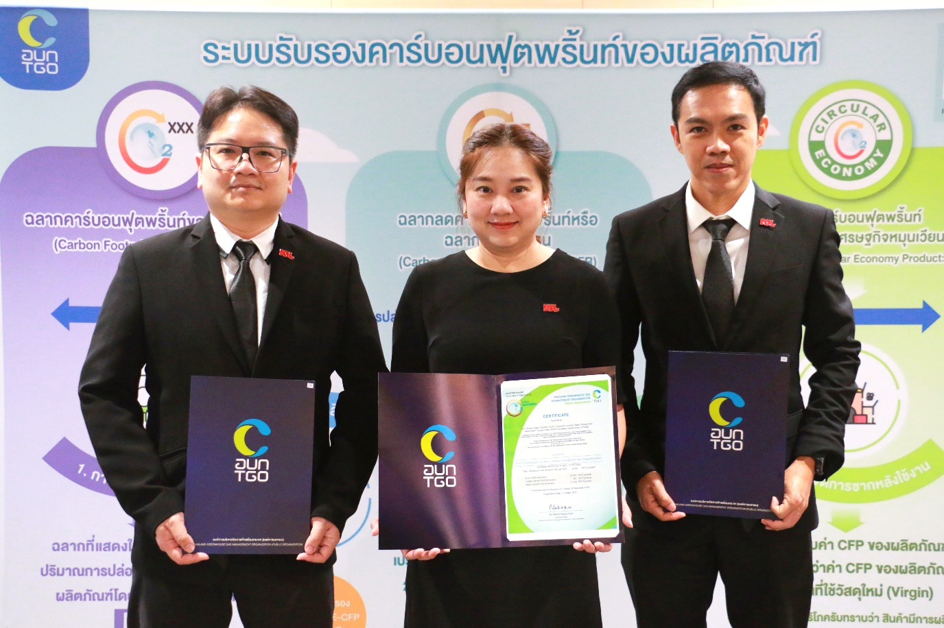 กลุ่มน้ำตาลขอนแก่น (KSL Group) โดยนายสกุลรัตน์ ศิริพันธ์โนน รองกรรมการผู้จัดการใหญ่ (ขวา), นางกัลยรัตน์ สุมิตร ผู้ช่วยกรรมการผู้จัดการใหญ่ (กลาง) และนายกมนดนัย ชินธรรมมิตร์ ผู้ช่วยกรรมการผู้จัดการใหญ่ (ซ้าย) เข้ารับมอบประกาศนียบัตรเครื่องหมายรับรองคาร์บอนฟุตพริ้นองค์กร (CFO) จาก นางสาวภัทรานันท์ ทองประพาฬ รองเลขาธิการนายกรัฐมนตรีฝ่ายการเมือง ในพิธีมอบประกาศนียบัตรเครื่องหมายรับรองฉลากคาร์บอน โดยองค์การบริหารจัดการก๊าชเรือนกระจก (องค์การมหาชน) สะท้อนการเดินหน้าขับเคลื่อนการลดปริมาณการปล่อยก๊าชเรือนกระจกในทุกมิติขององค์กร ผลักดันนโยบายสังคมคาร์บอนต่ำ และเพิ่มขีดความสามารถการแข่งขันในระดับสากลให้กับอุตสาหกรรมอ้อยและน้ำตาลของประเทศไทย ณ สถาบันเพื่อการยุติธรรมแห่งประเทศไทย (TIJ) เมื่อเร็ว ๆ นี้