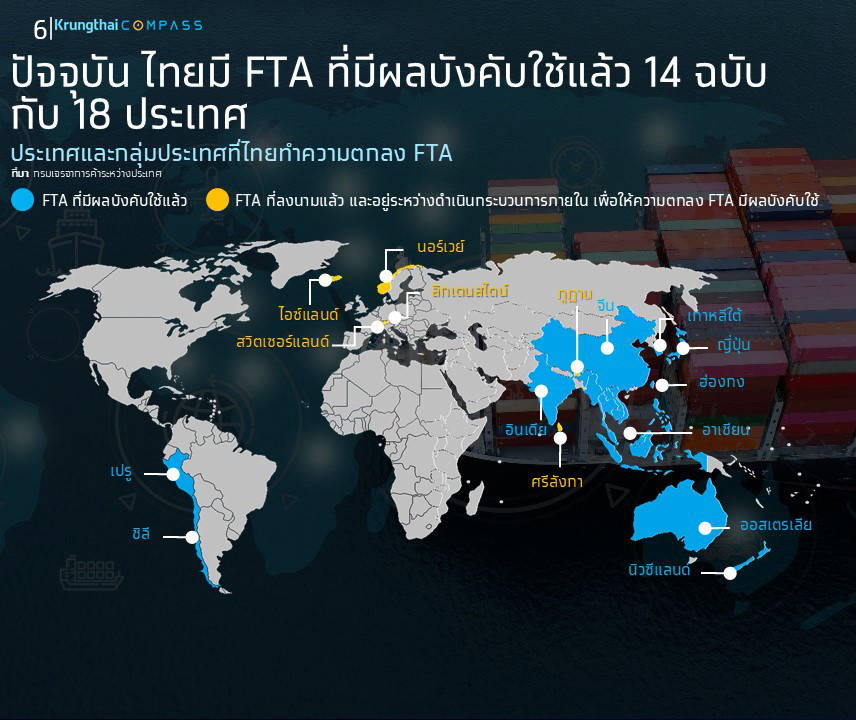 “Krungthai COMPASS มองว่า การปลดล็อกศักยภาพทางการค้าและการลงทุนของไทย ภายใต้ FTA จำเป็นต้องอาศัยความร่วมมือจากทุกภาคส่วนที่เกี่ยวข้องด้วยแนวคิด F-T-A (Flexibility-Trade Facilitation-Awareness) โดยผู้ประกอบการไทยจำเป็นต้องมีความยืดหยุ่นในการปรับตัว ศึกษาความต้องการของลูกค้า ขณะที่ภาครัฐสามารถเร่งเจรจาจัดทำ FTA กับตลาดใหม่ที่มีศักยภาพ ควบคู่ไปกับการปฏิรูปกฎระเบียบให้ทันสมัย เพื่อลดอุปสรรคทางการค้าและการลงทุน รวมทั้งอาจมีการพัฒนาระบบบริการเบ็ดเสร็จ (One-stop service) เพื่อให้ข้อมูลและคำปรึกษาแก่ผู้ประกอบการในการใช้สิทธิประโยชน์จาก FTA นอกจากนี้ ยังสามารถเพิ่มการประชาสัมพันธ์ เพื่อให้ผู้ประกอบการตระหนักถึงสิทธิประโยชน์ด้านภาษีศุลกากร ภายใต้ FTA รวมทั้งให้ความรู้เกี่ยวกับกฎว่าด้วยถิ่นกำเนิดสินค้า และหลักเกณฑ์ระเบียบปฏิบัติในการขอใช้สิทธิ FTA เพื่อให้ผู้ประกอบการไทยใช้ประโยชน์จาก FTA ในระดับเต็มที่ โดยเฉพาะผู้ประกอบการ SMEs เพื่อสร้างความสามารถในการแข่งขันของไทยได้อย่างยั่งยืน”