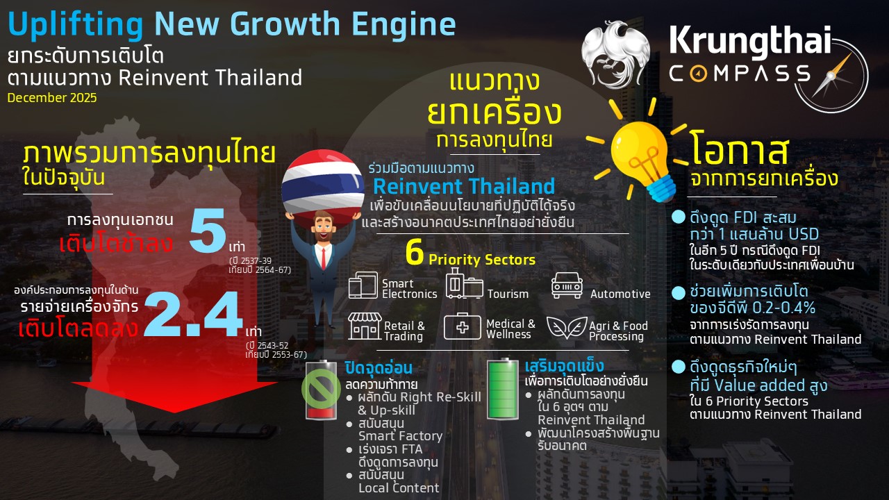 Krungthai COMPASS ชี้การยกเครื่องการลงทุนตามแนวทาง Reinvent Thailand จะช่วยเพิ่มอัตราเติบโตจีดีพีระยะข้างหน้าได้อีกประมาณ 0.2-0.4% ต่อปี