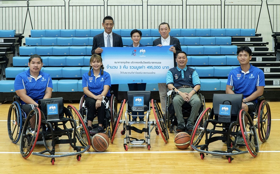 นางสาวนวลศิริ ไวทยานุวัตติ ผู้ช่วยกรรมการผู้จัดการใหญ่ ธนาคารกรุงไทย เป็นผู้แทนธนาคาร มอบวีลแชร์บาสเกตบอลให้กับสมาคมวีลแชร์บาสเกตบอลไทย จำนวน 3 คัน รวมมูลค่า 495,000 บาท ซึ่งออกแบบเป็นพิเศษ เพื่อรองรับสรีระที่แตกต่างของนักกีฬา น้ำหนักเบา ล้อลาดเอียงเพื่อความคล่องตัว สามารถยกตะแคงเอียงข้าง เพื่อเพิ่มความสูงในการชู้ตบาส สำหรับใช้ฝึกซ้อมเพื่อเข้าร่วมการแข่งขัน U23 MEN Wheelchair Basketball World Championship Phuket, Thailand 2021 ที่จังหวัดภูเก็ต เมื่อเดือนกันยายน 2565 ที่ผ่านมา และเตรียมความพร้อมเข้าร่วมการแข่งขัน 2022 IWBF WORLD CHAMPIONSHIPS ในเดือนมิถุนายน 2566 ที่ประเทศสหรัฐอาหรับเอมิเรตส์ เพื่อส่งเสริมรากฐานกีฬาไทย ให้เข้มแข็ง และพัฒนาศักยภาพทัพนักกีฬาไทยไปสู่การแข่งขันระดับโลก สอดคล้องกับวิสัยทัศน์ “กรุงไทยเคียงข้างไทย สู่ความยั่งยืน” โดยมี นายภัทรพันธุ์ กฤษณา นายกสมาคมวีลแชร์บาสเกตบอลไทย นายชยพร พรประภา ประธานกรรมการบริหาร และ นายชินจิ ฮายาชิ กรรมการบริหาร บริษัท ไคโก ไลฟ์ จำกัด เป็นผู้รับมอบ ณ ศูนย์ฝึกกีฬาในร่ม ราชมังคลากีฬาสถาน