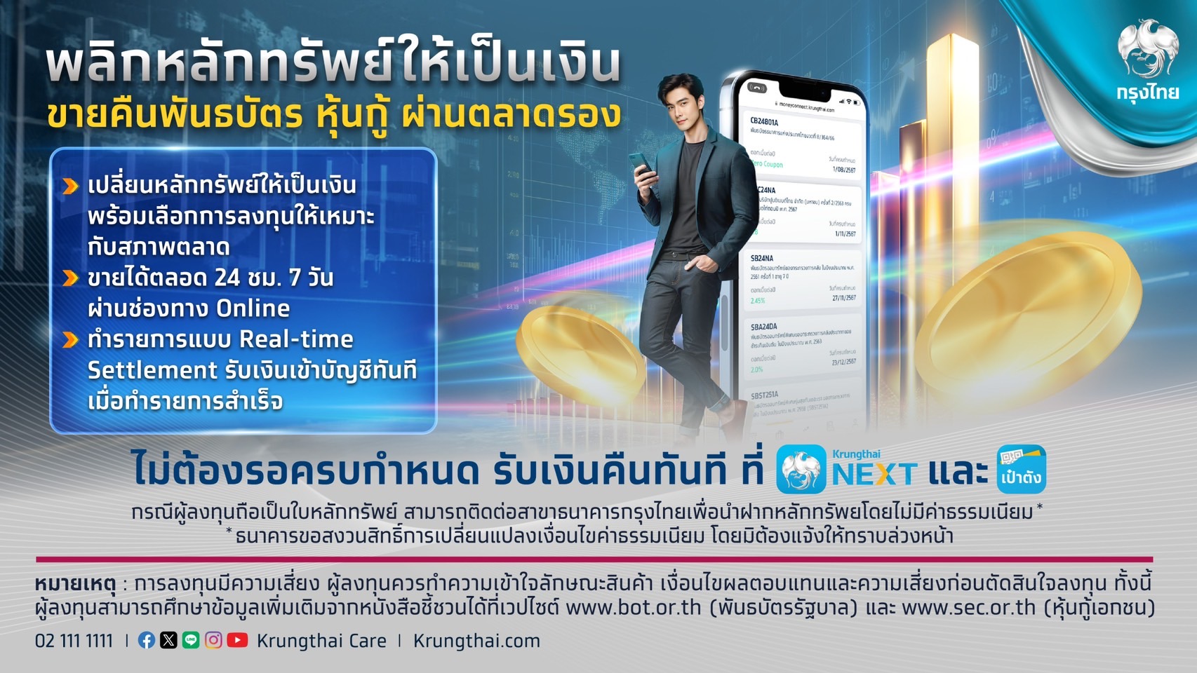 นอกจากนี้ ธนาคารยังให้บริการรับซื้อและขายคืนพันธบัตรและหุ้นกู้ ก่อนครบกำหนดผ่านตลาดรอง เพื่อเสริมสภาพคล่อง และเปิดโอกาสให้ผู้ลงทุนปรับพอร์ตตราสารหนี้ให้สอดคล้องกับสภาวะตลาด โดยสามารถตรวจสอบรุ่น ราคารับซื้อ และทำรายการได้ตลอด 7 วัน 24 ช.ม. ผ่านบริการ Money Connect บนแอปพลิเคชัน Krungthai NEXT สำหรับพันธบัตรออมทรัพย์ และหุ้นกู้ทั่วไป ส่วนพันธบัตรออมทรัพย์หรือหุ้นกู้รุ่นวอลเล็ตสามารถทำรายการได้ผ่านแอปฯเป๋าตัง