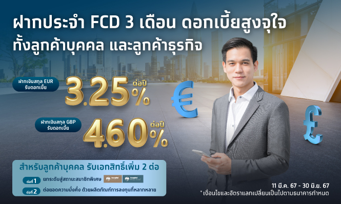 ธนาคารกรุงไทย ในฐานะธนาคารพาณิชย์ชั้นนำของประเทศ เดินหน้าพัฒนาผลิตภัณฑ์และบริการ เพิ่มทางเลือกการบริหารจัดการทางการเงิน ให้กับผู้ฝากเงินสกุลต่างประเทศ ด้วยบริการบัญชีเงินฝากเงินตราต่างประเทศ (FCD) ประเภทเงินฝากประจำ ระยะเวลา 3 เดือน ประกอบด้วยเงินฝากประจำสกุลเงินยูโร (EUR) รับอัตราดอกเบี้ย 3.25% ต่อปี และเงินฝากประจำสกุลเงินปอนด์สเตอร์ลิง (GBP) รับอัตราดอกเบี้ย 4.60% ต่อปี ทั้งลูกค้าบุคคลและลูกค้าธุรกิจ