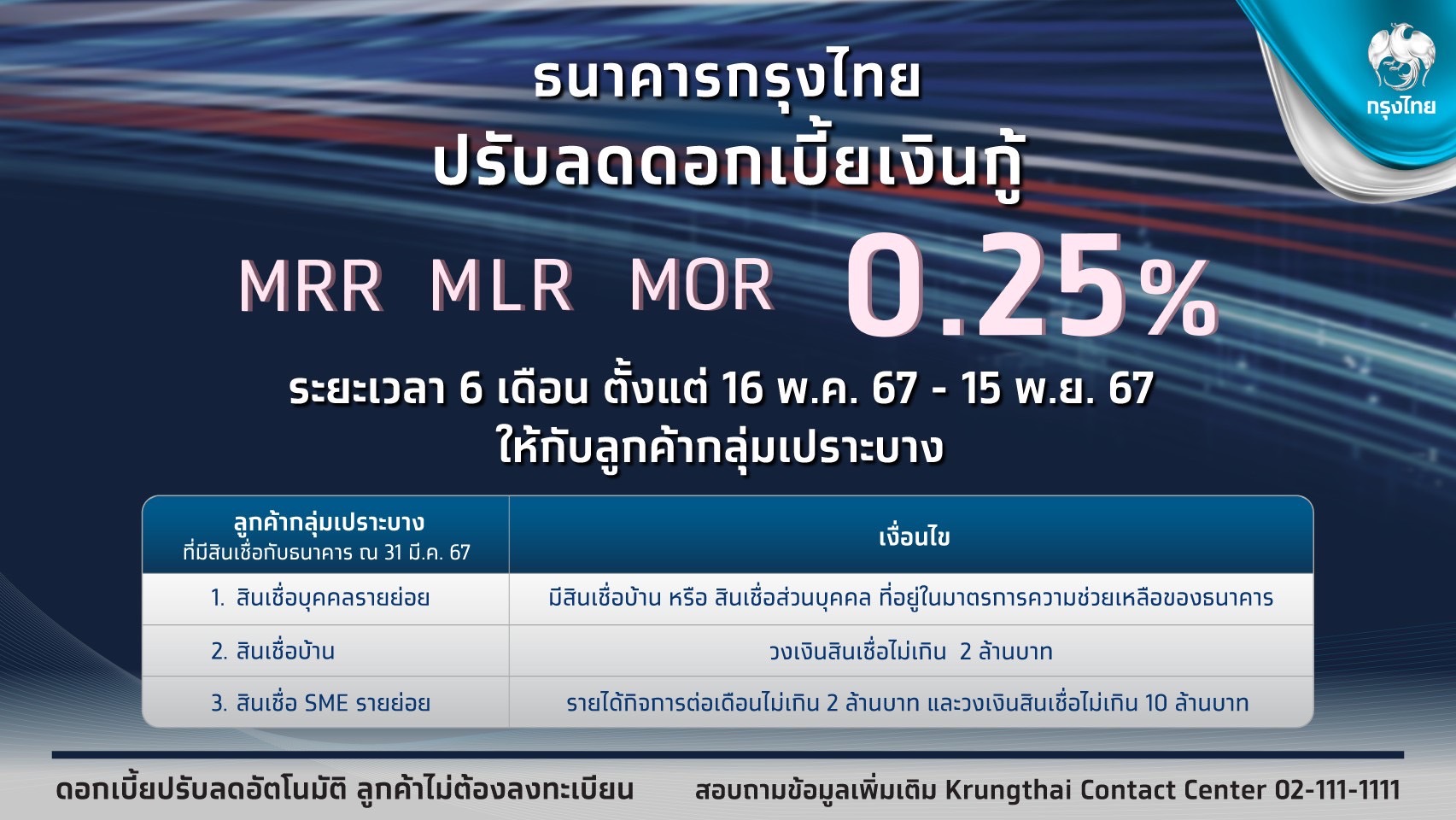 ธนาคารกรุงไทย ขานรับมาตรการภาครัฐ เร่งบรรเทาความเดือดร้อนกลุ่มเปราะบางที่ได้รับผลกระทบจากเศรษฐกิจที่ฟื้นตัวไม่เต็มที่ ออกมาตรการเพิ่มเติม โดยปรับลดอัตราดอกเบี้ยเงินกู้ MRR MLR และ MOR 0.25% เป็นเวลา 6 เดือน มีผลตั้งแต่วันที่ 16 พ.ค.-15 พ.ย.67 ให้กับลูกค้ากลุ่มเปราะบางกว่า 3 แสนบัญชี วงเงินสินเชื่อรวมกว่า 2 แสนล้านบาท ให้มีโอกาสปรับตัวและฟื้นตัว