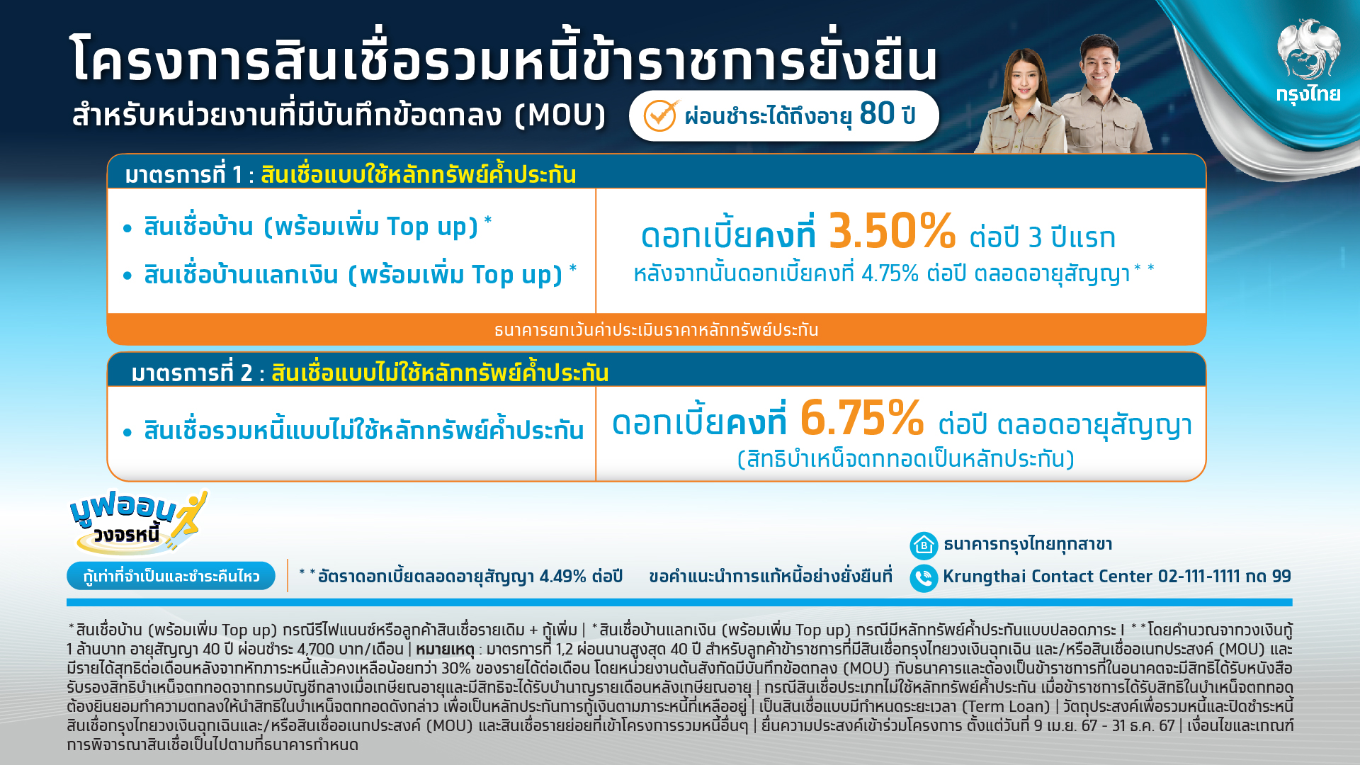 ในฐานะธนาคารพาณิชย์ของรัฐ ธนาคารกรุงไทยสนับสนุนการแก้ไขปัญหาหนี้ข้าราชการกลุ่มเปราะบาง ตามนโยบายของรัฐบาลและท่านนายกรัฐมนตรีอย่างต่อเนื่อง โดยร่วมมือกับส่วนราชการที่เกี่ยวข้อง และบริษัทข้อมูลเครดิตแห่งชาติ ( เครดิตบูโร) ในการแก้ไขปัญหาหนี้แบบองค์รวมอย่างเป็นระบบ ผ่านโครงการ “สินเชื่อรวมหนี้ข้าราชการยั่งยืน” เพิ่มเติมจากมาตรการความช่วยเหลือข้าราชการที่ทำมาอย่างต่อเนื่อง โดยเร่งพัฒนารูปแบบและวิธีการต่างๆ เพื่อก้าวข้ามข้อจำกัด ปัญหาและอุปสรรคในเชิงระบบ ทั้งด้านการเข้าถึงข้อมูลที่จำเป็นในการประเมินสภาพและสถานะของหนี้ ความสามารถในการชำระหนี้ เพื่อให้สามารถช่วยเหลือข้าราชการได้อย่างตรงจุด ทันการณ์ และเพิ่มความสามารถในการดำรงชีพของข้าราชการอย่างเหมาะสม