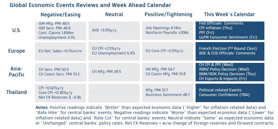 สำหรับสัปดาห์นี้ เราประเมินว่า ควรระวังความผันผวน จากการเลือกตั้งสภาฝรั่งเศสรอบสองและประเด็นการเมืองของไทย และรอจับตารายงานอัตราเงินเฟ้อ CPI ของสหรัฐฯ รวมถึงถ้อยแถลงของประธานเฟดต่อสภาคองเกรส