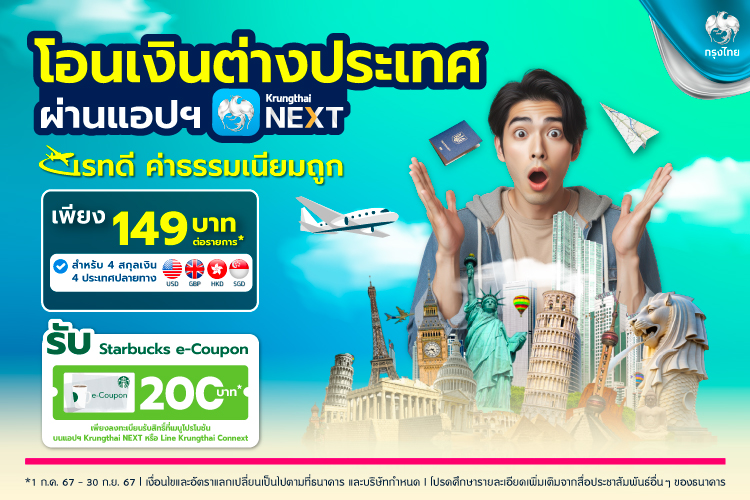 ธนาคารกรุงไทย ในฐานะธนาคารพาณิชย์ชั้นนำในประเทศ มุ่งมั่นพัฒนาผลิตภัณฑ์และบริการทางการเงิน ตอบโจทย์ลูกค้าทุกกลุ่มในทุกมิติ มอบโปรโมชันโอนเงินต่างประเทศ สุดคุ้ม 2 ต่อ ต่อที่ 1 ค่าธรรมเนียม เพียง 149 บาทต่อรายการ (จากปกติ 299 บาท) เมื่อทำรายการโอนเงินต่างประเทศผ่านแอปพลิเคชัน Krungthai NEXT รองรับ 4 สกุลเงิน 4 ประเทศปลายทาง ได้แก่ ดอลลาร์สหรัฐ (USD) ประเทศสหรัฐอเมริกา, ปอนด์สเตอร์ลิง (GBP) ประเทศอังกฤษ, ดอลลาร์สิงคโปร์ (SGD) ประเทศสิงคโปร์ และดอลลาร์ฮ่องกง (HKD) ประเทศฮ่องกง ต่อที่ 2 รับ Starbucks e-Coupon มูลค่า 200 บาท เพียงลงทะเบียนรับสิทธิ์ที่เมนูโปรโมชั่นบนแอปฯ Krungthai NEXT หรือ Krungthai Connext ตั้งแต่วันที่ 1 กรกฎาคม–30 กันยายน 2567