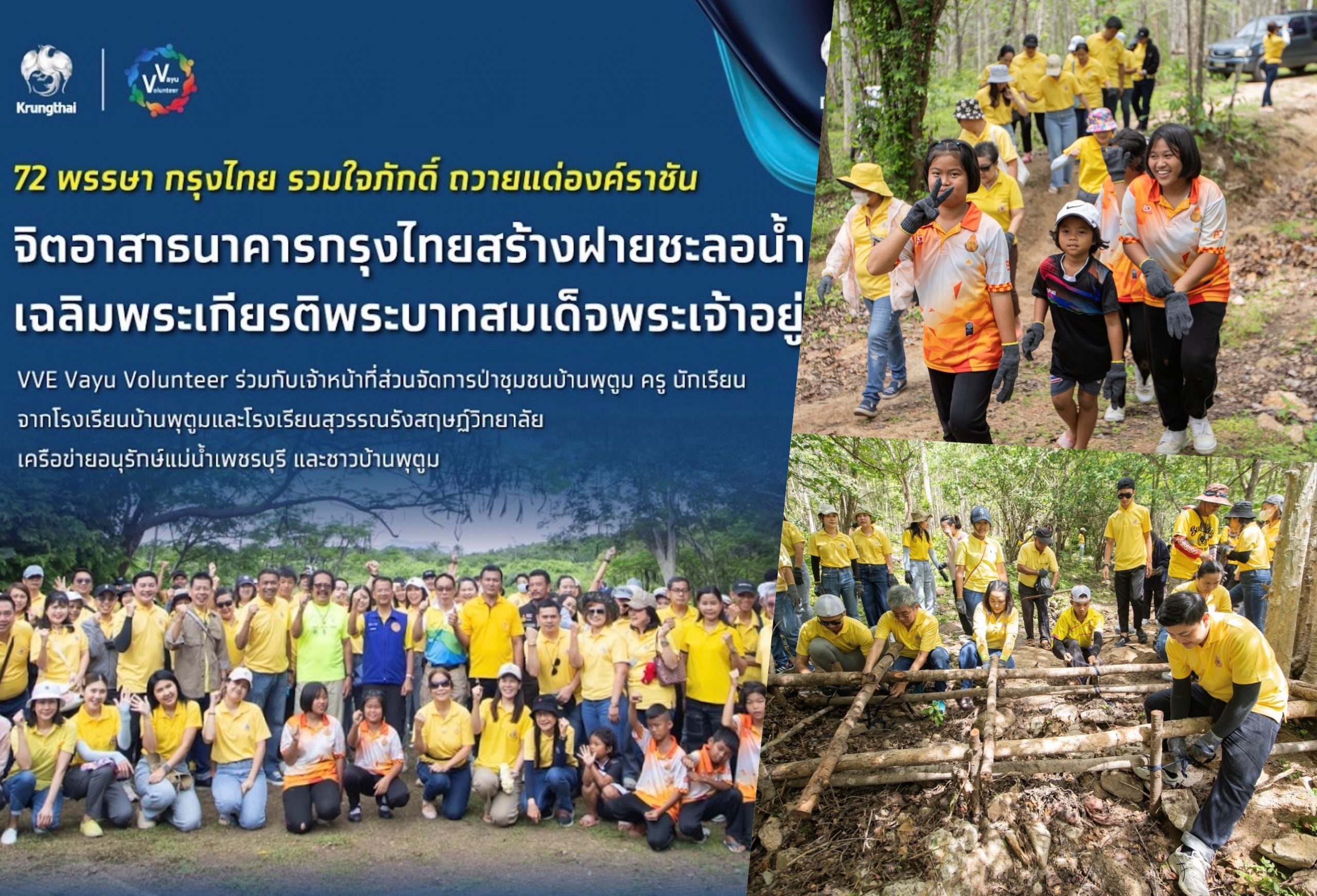 ธนาคารกรุงไทย นำพนักงานกรุงไทยจิตอาสา (VVE Vayu Volunteer) ร่วมกับเจ้าหน้าที่ส่วนจัดการป่าชุมชนบ้านพุตูม พร้อมด้วยบุคลากรจากโรงเรียนบ้านพุตูม โรงเรียนสุวรรณรังสฤษฎ์วิทยาลัย เครือข่ายอนุรักษ์แม่น้ำเพชรบุรี และประชาชนในพื้นที่กว่า 170 คน ร่วมสร้างฝายชะลอน้ำ ณ ป่าชุมชนบ้านพุตูม อ.บ้านลาด จ.เพชรบุรี จำนวน 10 ฝาย เพื่อน้อมรำลึกในพระมหากรุณาธิคุณ และเฉลิมพระเกียรติพระบาทสมเด็จพระเจ้าอยู่หัว เนื่องในโอกาสมหามงคลเฉลิมพระชนมพรรษา 6 รอบ 28 กรกฎาคม 2567 ตลอดจนเป็นการสืบสานและต่อยอดพระราชปณิธานพระบาทสมเด็จพระบรมชนกาธิเบศรมหาภูมิพลอดุลยเดชมหาราช บรมนาถบพิตร โดยความร่วมมือในการสร้างฝายชะลอน้ำครั้งนี้ เพื่อช่วยเก็บกักน้ำ สำหรับใช้อุปโภคบริโภค แก้ปัญหาภัยธรรมชาติ อาทิ ภัยแล้ง อุทกภัย ไฟป่า และดินโคลนถล่ม อีกทั้ง ยังช่วยอนุรักษ์ฟื้นฟูป่าต้นน้ำและระบบนิเวศให้กลับมามีความอุดมสมบูรณ์อย่างยั่งยืน พลิกฟื้นชีวิตให้แก่ชาวบ้าน ก่อให้เกิดความรัก ความสามัคคีกลับคืนสู่คนในพื้นที่ อันเป็นการสืบสานศาสตร์พระราชาที่ว่า “การสร้างฝายได้มากกว่าน้ำ”