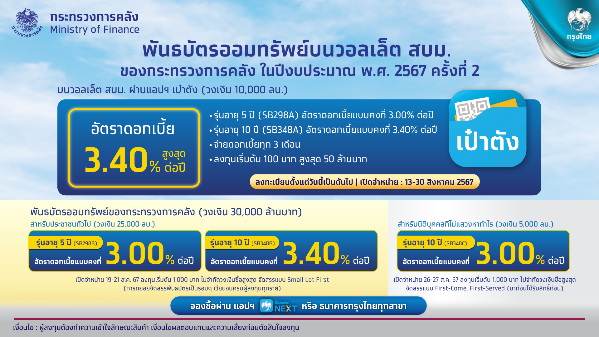 ธนาคารกรุงไทย เดินหน้าตอบโจทย์ผู้ลงทุน สร้างความมั่นคงทางการเงิน เตรียมเสนอขายพันธบัตรออมทรัพย์วอลเล็ต สบม. ของกระทรวงการคลัง ในปีงบประมาณ พ.ศ. 2567 ครั้งที่ 2 ผ่านแอปฯ เป๋าตัง จำนวน 2 รุ่น วงเงิน 10,000 ล้านบาท รุ่นอายุ 5 ปี ดอกเบี้ยคงที่ 3 % ต่อปี และรุ่นอายุ 10 ปี ดอกเบี้ยคงที่ 3.40% ต่อปี ลงทุนง่าย เริ่มต้นเพียง 100 บาท ส่งเสริมคนไทยออมเงินอย่างทั่วถึงและยั่งยืน เตรียมเสนอขายวันที่ 13-30 สิงหาคมนี้