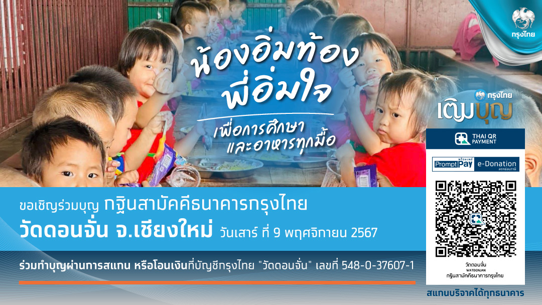 กรุงไทย ขอเชิญร่วมบุญมหากุศลกฐินสามัคคี “น้องอิ่มท้อง พี่อิ่มใจ” ช่วยเหลือเด็กผู้ยากไร้ วัดดอนจั่น จ.เชียงใหม่