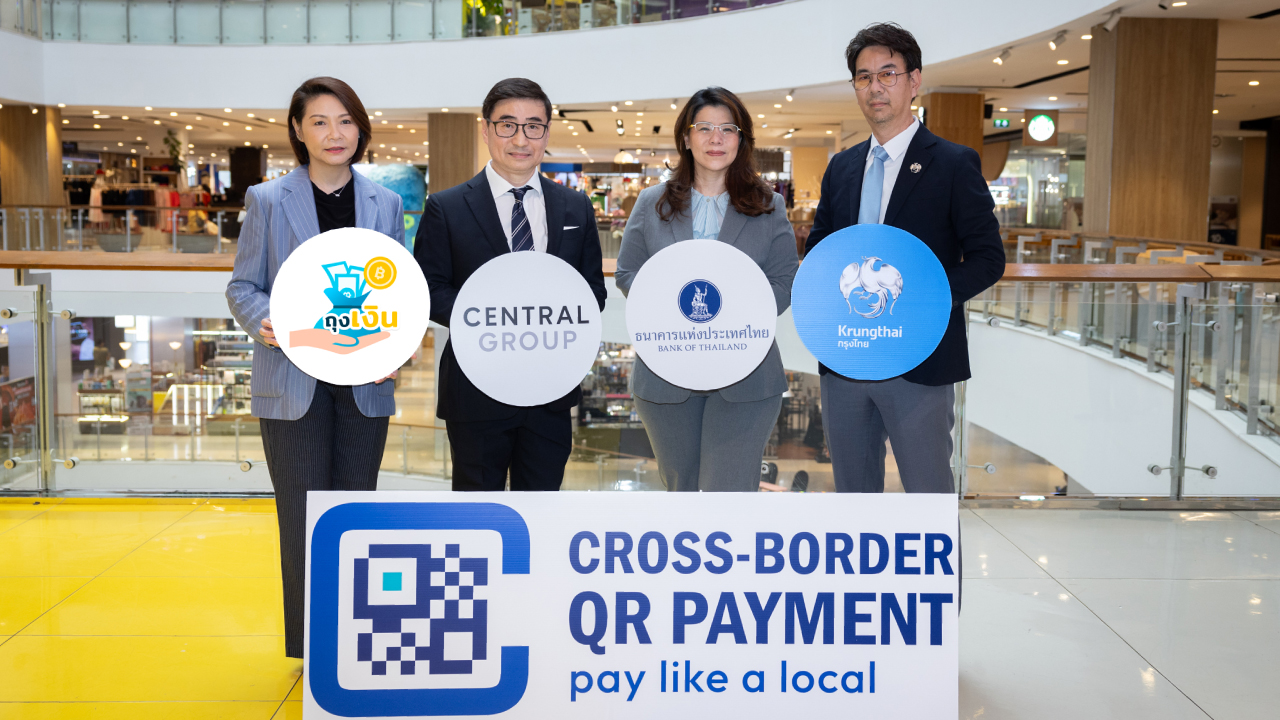 นายกิติพงศ์ มุตตามระ ผู้ช่วยกรรมการผู้จัดการใหญ่ ธนาคารกรุงไทย นายมนตรี สิทธิญาวณิชย์ รองกรรมการผู้จัดการใหญ่ ฝ่ายผลิตภัณฑ์และบริการทางการเงิน กลุ่มเซ็นทรัล และนางสาวดารณี แซ่จู ผู้ช่วยผู้ว่าการ สายกำกับระบบการชำระเงินและคุ้มครองผู้ใช้บริการทางการเงิน ธนาคารแห่งประเทศไทย (ธปท.) ร่วมกันอำนวยความสะดวกชำระค่าสินค้าและบริการข้ามพรมแดน Cross-Border QR Payment ให้กับนักท่องเที่ยวต่างชาติ