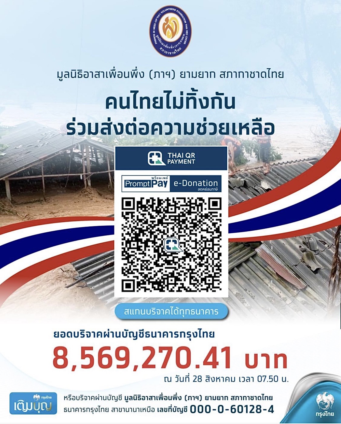 ทั้งนี้ ผู้มีจิตศรัทธาสามารถร่วมบริจาค เพื่อส่งต่อความช่วยเหลือให้แก่ผู้ประสบอุทกภัย ผ่านมูลนิธิอาสาเพื่อนพึ่ง (ภาฯ) ยามยาก สภากาชาดไทย ด้วยการสแกน QR Code E-Donation ผ่านแอปพลิเคชันของทุกธนาคาร ซึ่งข้อมูลการบริจาคจะส่งเข้าระบบลดหย่อนภาษีของกรมสรรพากรอัตโนมัติ หรือบริจาคผ่านบัญชีออมทรัพย์ ชื่อบัญชี มูลนิธิอาสาเพื่อนพึ่ง (ภาฯ) ยามยาก สภากาชาดไทย ธนาคารกรุงไทย สาขานานาเหนือ เลขที่ 000-0-601-28-4 หรือดูรายละเอียดเพิ่มเติมได้ที่ https://krungthai.com/link/edonation-flood2024-fb