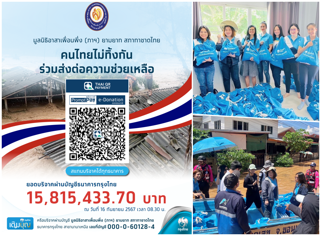 นอกจากนี้ ธนาคารกรุงไทย ได้ร่วมกับ มูลนิธิอาสาเพื่อนพึ่ง (ภาฯ) ยามยาก สภากาชาดไทย ส่งต่อความช่วยเหลือจากคนไทยผู้มีจิตศรัทธาที่ร่วมบริจาคเงินผ่านบัญชีออมทรัพย์ ชื่อบัญชี มูลนิธิอาสาเพื่อนพึ่ง (ภาฯ) ยามยาก สภากาชาดไทย ธนาคารกรุงไทย สาขานานาเหนือ เลขที่ 000-0-60128-4 มียอดบริจาค ณ วันที่ 16 กันยายน 2567 รวมทั้งสิ้น 15,815,433,70 บาท