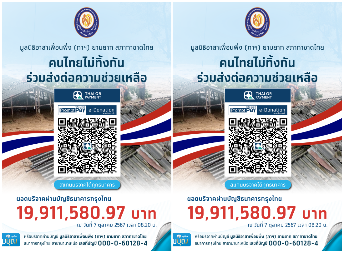 ผู้ที่มีจิตศรัทธา สามารถร่วมบริจาคผ่านมูลนิธิอาสาเพื่อนพึ่ง (ภาฯ) ยามยาก สภากาชาดไทย ด้วยการสแกน QR Code E-Donation ผ่านแอปพลิเคชันของทุกธนาคาร ซึ่งข้อมูลการบริจาคจะส่งเข้าระบบลดหย่อนภาษีของกรมสรรพากรอัตโนมัติ หรือบริจาคผ่านบัญชีออมทรัพย์ ชื่อบัญชี มูลนิธิอาสาเพื่อนพึ่ง (ภาฯ) ยามยาก สภากาชาดไทย ธนาคารกรุงไทย สาขานานาเหนือ เลขที่ 000-0-60128-4