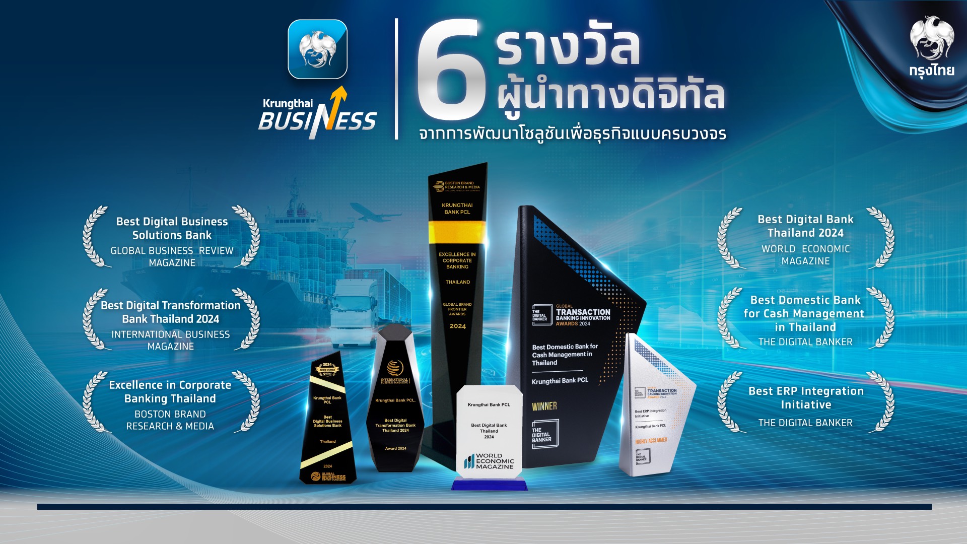 ธนาคารกรุงไทยได้รับ 6 รางวัลทรงเกียรติจากเวทีชั้นนำในระดับสากล จากความสำเร็จในการนำเทคโนโลยีและนวัตกรรมทางการเงินที่ทันสมัย พัฒนาโซลูชันเพื่อธุรกิจยุคใหม่แบบครบวงจรบนแพลตฟอร์ม Krungthai BUSINESS ตอบโจทย์ลูกค้าธุรกิจทุกกลุ่มในทุกมิติ ส่งมอบประสบการณ์การจัดการทางการเงินดิจิทัลที่สะดวก ปลอดภัย และมีประสิทธิภาพ ง่าย ครบ จบในแอปฯเดียว ประกอบด้วย รางวัล Global Brand Frontier Awards 2024 สาขา Excellence in Corporate Banking–Thailand จาก Boston Brand Research & Media สหรัฐอเมริกา รางวัล Best Digital Bank Thailand 2024 จาก World Economic Magazine สหราชอาณาจักร รางวัล Best Domestic Bank for Cash Management in Thailand-Winner และ รางวัล Best ERP Integration Initiative-Highly Acclaimed จาก The Digital Banker ประเทศสิงคโปร์ รางวัล Best Digital Business Solutions Bank Thailand 2024 จาก Global Business Review สหรัฐอาหรับเอมิเรตส์ และ รางวัล Best Digital Transformation Bank จาก International Business Magazine สหรัฐอาหรับเอมิเรตส์