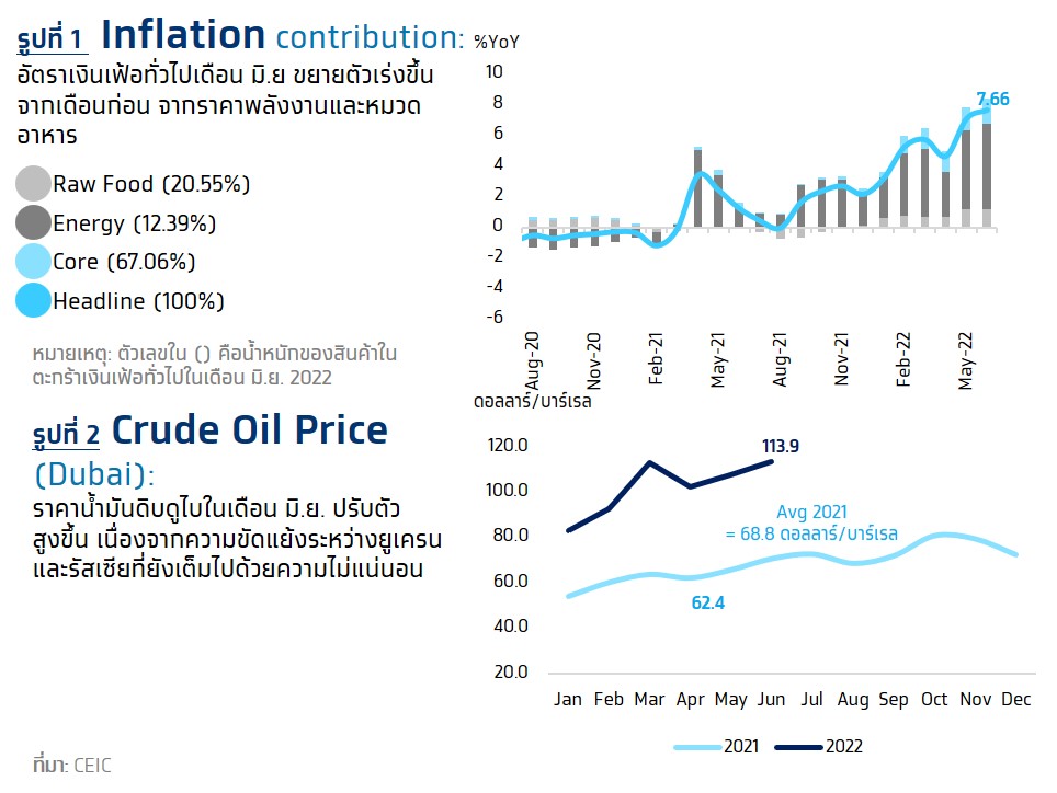 อัตราเงินเฟ้อทั่วไปเดือน มิ.ย. บวกเพิ่มขึ้นที่ 7.66% (YoY) ปัจจัยหลักจากราคาพลังงาน ทั้งน้ำมันเชื้อเพลิง ก๊าซหุงต้ม และค่าไฟฟ้า ที่ภาครัฐมีการขยายเพดานการตรึงราคาตามต้นทุนที่สูงขึ้น รวมถึงหมวดอาหารและเครื่องดื่มไม่มีแอลกอฮอล์ที่ปรับขึ้นสูง โดยเฉพาะ กลุ่มเนื้อสัตว์ เป็ดไก่ และสัตว์น้ำ และกลุ่มเครื่องประกอบอาหาร ด้านอัตราเงินเฟ้อพื้นฐานเพิ่มขึ้นจากเดือนก่อนอยู่ที่ 2.51%