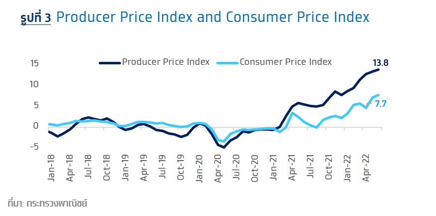 อัตราเงินเฟ้อทั่วไปเดือน มิ.ย. อยู่ที่ 7.66% (YoY) เร่งขึ้นจากเดือนก่อนที่ 7.10% (YoY) สูงกว่าที่นักวิเคราะห์มองไว้ที่ค่ากลาง 7.50% (YoY) ปัจจัยหลักจากราคาพลังงาน ทั้งน้ำมันเชื้อเพลิง ก๊าซหุงต้ม และค่าไฟฟ้า ที่ภาครัฐมีการขยายเพดานการตรึงราคาตามต้นทุนที่สูงขึ้น ทำให้ราคาพลังงานขยายตัวเร่งขึ้นที่ 39.97% (YoY) เทียบกับเดือนก่อนที่ 37.24% (YoY) รวมทั้ง หมวดอาหารและเครื่องดื่มไม่มีแอลกอฮอล์ที่ปรับตัวเร่งขึ้นเช่นกันขึ้น โดยราคาสินค้าในกลุ่มอาหารสดตัวเร่งขึ้นเล็กน้อยที่ 5.87% (YoY) เทียบกับเดือนก่อนที่ 5.82% (YoY) จากแรงผลักดันของเนื้อสัตว์ โดยเฉพาะ สุกรที่ปริมาณผลผลิตออกสู่ตลาดลดลง ประกอบกับต้นทุนการเลี้ยงที่สูงขึ้นส่งผลให้เกษตรกรชะลอการเลี้ยง ขณะที่ ข้าว แป้งและผลิตภัณฑ์จากแป้ง ราคาปรับลดลง โดยเฉพาะราคาข้าวสาร เนื่องจากปริมาณผลผลิตมีจำนวนมาก และมีการจัดโปรโมชันตามห้างสรรพสินค้า