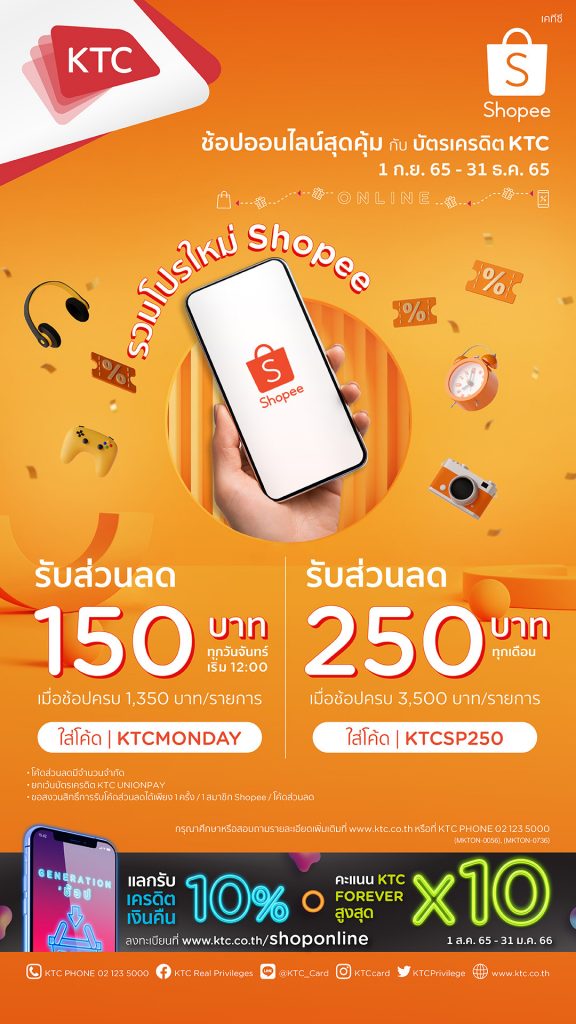 “เคทีซี” หรือ บริษัท บัตรกรุงไทย จำกัด (มหาชน) จัดโปรโมชันสุดคุ้มสำหรับสมาชิกบัตรเครดิตเคทีซี รับส่วนลด 150 บาท เมื่อช้อปสินค้าทุกวันจันทร์ (เริ่ม 12.00 น.) ครบ 1,350 บาท ผ่านแอปฯ Shopee (ช้อปปี้) และใส่โค้ด KTCMONDAY รับส่วนลด 250 บาท ทุกเดือน เมื่อช้อปผ่านแอปพลิเคชัน Shopee ครบ 3,500 บาทต่อรายการ เพียงระบุรหัสส่วนลด “KTCSP250 ระหว่างวันที่ 1 กันยายน 2565 – 31 ธันวาคม 2565