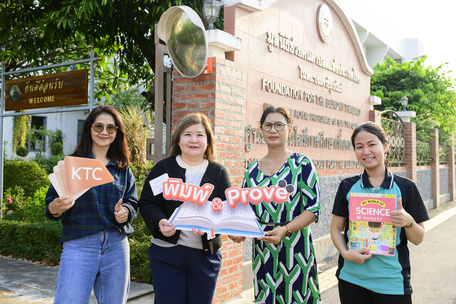 นางสาวปิยะสุดา แคว้นนนทรีย์ (กลางซ้าย) ผู้บริหารสูงสุด สายงานทรัพยากรบุคคล “เคทีซี” หรือ บริษัท บัตรกรุงไทย จำกัด (มหาชน) มอบไฟล์หนังสือเรียน ภายใต้โครงการ “พิมพ์ & Prove” เพื่อน้องผู้พิการทางสายตา โดยไฟล์เสียงนี้ผู้บริหารและพนักงานจิตอาสาเคทีซีกว่า 50 คน ร่วมแรง ร่วมใจกันจัดพิมพ์ และตรวจทานหนังสือเรียนจากแบบเรียนต้นฉบับต่างๆ ที่น้องๆ สายตาปกติใช้ในห้องเรียน เพื่อมอบให้กับน้องๆ ผู้พิการทางสายตาที่ศึกษาในระดับชั้นมัธยมศึกษา ผ่านศูนย์เทคโนโลยีการศึกษาเพื่อคนตาบอด มูลนิธิช่วยคนตาบอดแห่งประเทศไทยในพระบรมราชินูปถัมภ์ โดยมีนางชนิดาภา เพ็ชรรักษ์ (กลางขวา) ผู้อำนวยการ ศูนย์เทคโนโลยีการศึกษาเพื่อคนตาบอด เป็นผู้รับมอบ ณ ศูนย์เทคโนโลยีการศึกษาเพื่อคนตาบอดปากเกร็ด เมื่อเร็วๆ นี้