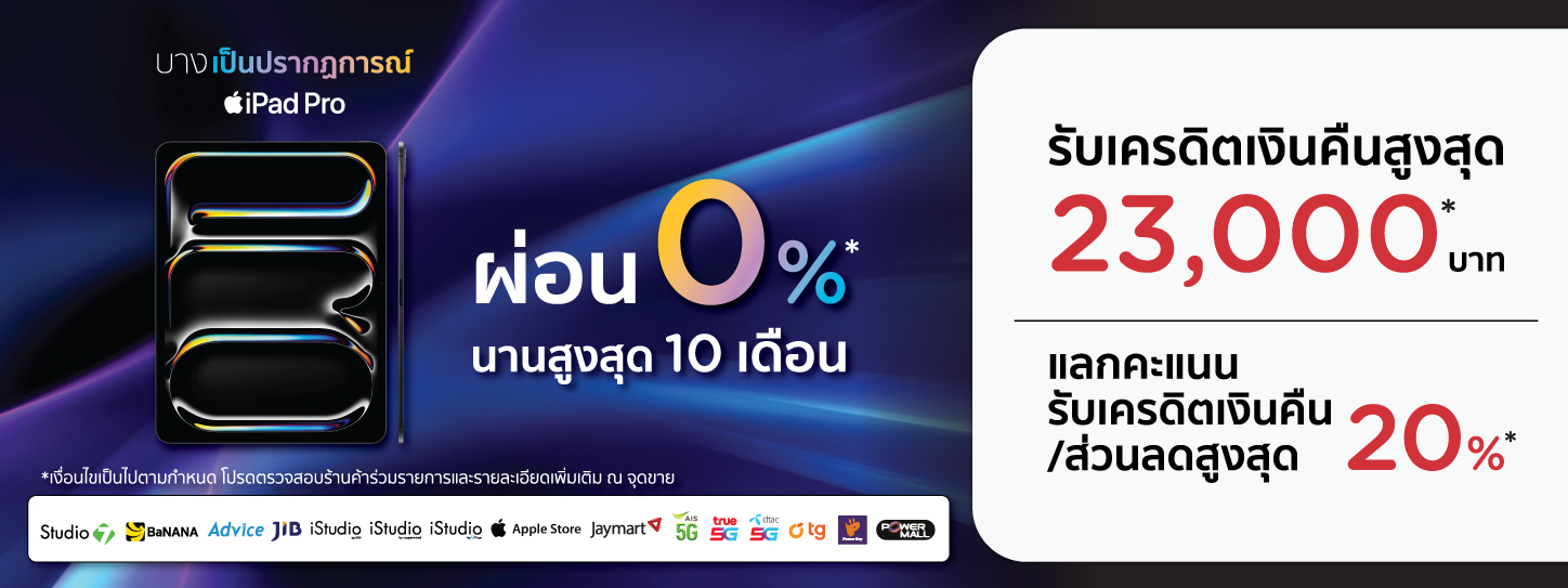 เคทีซี จับมือพันธมิตรร้านไอที/มือถือชั้นนำ มอบสิทธิพิเศษแก่สมาชิก ช้อป New iPad Pro 2024 และ New iPad Air 2024 เมื่อชำระด้วยบัตรเครดิตเคทีซี จัดเต็มความคุ้มค่าทั้งผ่อน 0% นานสูงสุด 10 เดือน รับเครดิตเงินคืนสูงสุด 23,000 บาท และใช้คะแนน KTC FOREVER แลกรับเครดิตเงินคืน หรือส่วนลดสูงสุด 20% ระหว่างวันที่ 24 พฤษภาคม 2567–30 มิถุนายน 2567