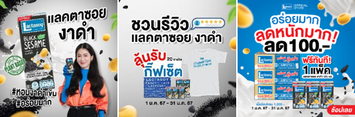 นอกจากนี้ ยังมาพร้อมโปรโมชันลดฉ่ำรับปีใหม่ ช้อปลด 100 บาท แถมอีก 1 เเพ็ค (เเลคตาซอยงาดำ 125 ml. 6 กล่อง) เมื่อซื้อสินค้าเเบรนด์เเลคตาซอย ทุกขนาด ทุกรสชาติ ตั้งแต่ 1,000 บาท ขึ้นไปที่ https://bit.ly/3Y9tv4x พร้อมจัดส่งตั้งแต่วันนี้ถึง 31 ม.ค. 67
