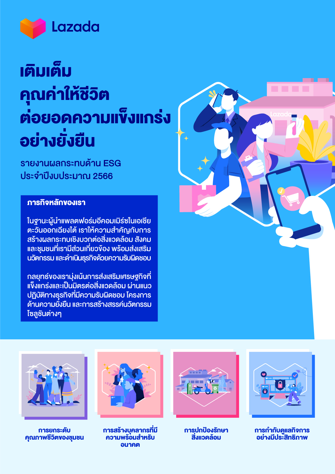 ลาซาด้า ได้เผยแพร่รายงานผลกระทบด้านสิ่งแวดล้อม สังคม และบรรษัทภิบาล (ESG) ประจำปี 2566 ในชื่อ “เติมเต็มคุณค่าให้ชีวิต ต่อยอดความแข็งแกร่งอย่างยั่งยืน” (Enriching Lives, Emerging Stronger) ซึ่งรวบรวมผลการดำเนินงานของบริษัทฯ ในการพัฒนาธุรกิจอีคอมเมิร์ซเพื่อสร้างผลกระทบเชิงบวก ภายใต้กรอบการทำงานด้าน ESG ที่ประกอบด้วย 4 เสาหลัก ได้แก่ การยกระดับคุณภาพชีวิตของชุมชน การสร้างบุคลากรที่มีความพร้อมสำหรับอนาคต การปกป้องรักษาสิ่งแวดล้อม และการกำกับดูแลกิจการอย่างมีประสิทธิภาพ