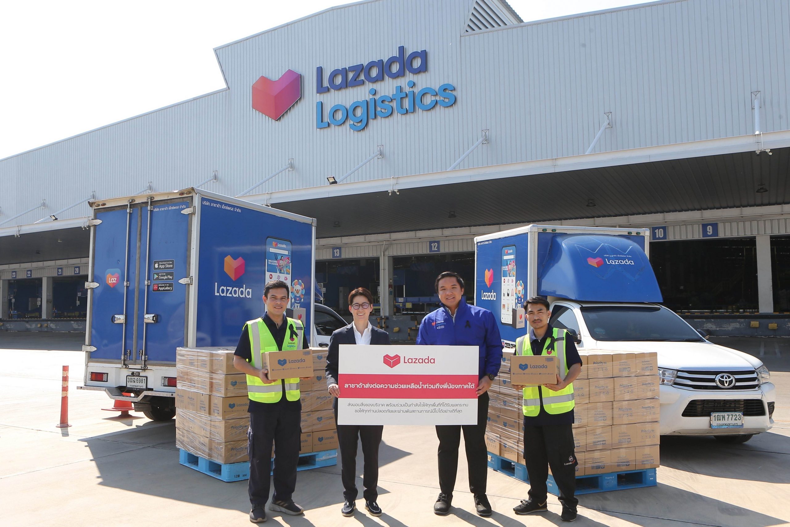 ลาซาด้า ประเทศไทย นำโดย นายณัฏฐพล เกรียงชัยเวทย์ (ที่สามจากซ้าย)ประธานเจ้าหน้าที่บริหารฝ่ายโลจิสติกส์ และ ดร. ธมกร ศุภธนรังสี (ที่สองจากซ้าย) รองประธานฝ่ายรัฐสัมพันธ์ ร่วมเป็นส่วนหนึ่งในการบรรเทาความเดือดร้อนแก่ผู้ประสบอุทกภัยในพื้นที่ภาคใต้ ผ่านแคมเปญพิเศษมอบสิ่งของอุปโภคบริโภคส่งตรงไปยังโรงพยาบาลสงขลานครินทร์ ผู้ใช้งานสามารถสั่งซื้อสิ่งของจำเป็นต่าง ๆ เพื่อบริจาค โดยลาซาด้าพร้อมอำนวยความสะดวกในการจัดส่ง พร้อมคูปองจัดส่งฟรีทุกออเดอร์และส่วนลดพิเศษสำหรับสินค้าบริจาค อีกทั้งยังมอบคูปองส่วนลดสูงสุด 15% แทนคำขอบคุณสำหรับการสั่งซื้อครั้งถัดไป* โดยเครือข่ายโลจิสติกส์ของลาซาด้าทั่วประเทศจะดำเนินการรวบรวมสิ่งของทั้งหมดส่งตรงไปยังโรงพยาบาลสงขลานครินทร์ เพื่อส่งต่อให้ผู้ที่ได้รับผลกระทบในพื้นที่ต่อไป