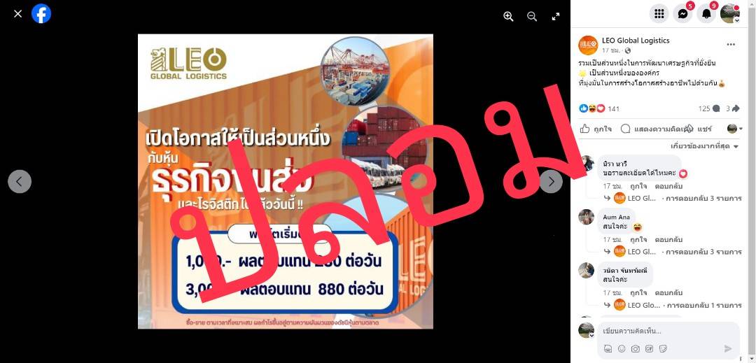 บริษัท ลีโอ โกลบอล โลจิสติกส์ จำกัด (มหาชน) (LEO) ขอเรียนชี้แจงให้ทุกท่านทราบถึงกรณีที่มีมิจฉาชีพ ได้มีการชักชวนประชาชนทั่วไป ให้ลงทุนหรือเสนอเป็นที่ปรึกษาการลงทุนผ่านทางโซเชียลมีเดีย โดยใช้ตราสัญลักษณ์ (โลโก้) หรือภาพธุรกิจของบริษัทฯ ไปใช้แอบอ้างและเผยแพร่ลงสื่อสังคมออนไลน์ต่างๆ เช่น Facebook , Line@ และสื่ออื่นๆ เพื่อสร้างความน่าเชื่อถือว่าเป็นการลงทุนกับ LEO ทั้งที่ไม่ได้เป็นความจริง และไม่ได้ดำเนินการ หรือมีส่วนเกี่ยวข้องกับ LEO แต่อย่างใด