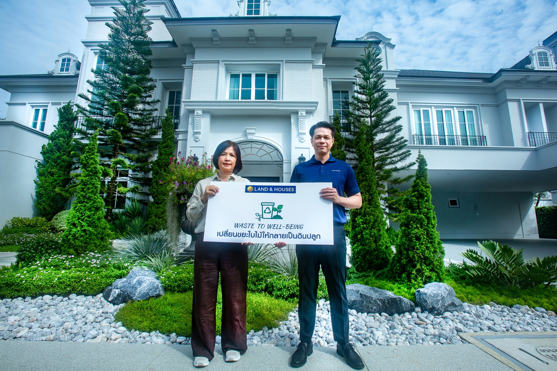 คุณภูมิใจ วรวนิชชากร ผู้จัดการฝ่ายออกแบบ บริษัท แลนด์ แอนด์ เฮ้าส์ จำกัด (มหาชน) และ คุณอรสา รอดบำเรอ ผู้จัดการ ห้างหุ้นส่วนจำกัด สวนไม้ภราดรภาพ ร่วมกันปลูกต้นไม้ลงดินปลูกที่ได้จากโครงการ WASTE TO WELL-BEING บนพื้นที่สวนของบ้านแลนด์ แอนด์ เฮ้าส์ โดยในปี 2568  บริษัทฯ ได้เริ่มดำเนินโครงการ WASTE TO WELL-BEING ซึ่งเป็นการดำเนินงานระยะนำร่อง ในการพัฒนากระบวนการแปรรูปขยะใบไม้ให้เป็นปุ๋ยอินทรีย์ และนำไปผลิตเป็นดินปลูกคุณภาพสูง ซึ่งเป็นความร่วมมือระหว่างแลนด์ แอนด์ เฮ้าส์ และห้างหุ้นส่วนจำกัด สวนไม้ภราดรภาพ โครงการนี้ช่วยลดปริมาณขยะอินทรีย์ที่ต้องเข้าสู่กระบวนการฝังกลบได้ถึง 218 ตัน หรือเทียบเท่าการลดการปล่อยก๊าซเรือนกระจก 173 ตันคาร์บอนไดออกไซด์เทียบเท่า (ตั้งแต่ต้นปี – สิ้นเดือนพฤศจิกายน) โดยสามารถผลิตปุ๋ยอินทรีย์จากเศษใบไม้ได้จำนวน 66 ตัน เมื่อนำไปผสมกับวัสดุปรับปรุงดินอื่น ๆ ตามสัดส่วน จะได้ดินปลูกคุณภาพสูงจำนวน 55,000 ถุง ที่นำไปใช้ในงานสวนภายในโครงการและช่วยลดการซื้อดินปลูกจากภายนอกซึ่งอาจมีคุณภาพไม่สม่ำเสมอหรือเสี่ยงต่อการปนเปื้อนสารเคมีอีกด้วย
