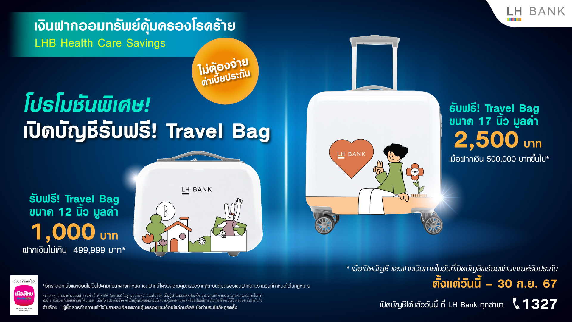 ธนาคารแลนด์ แอนด์ เฮ้าส์ จำกัด (มหาชน) เปิดเผยว่าจากที่ธนาคารได้ออกผลิตภัณฑ์เงินฝากออมทรัพย์ที่สร้างความคุ้มค่าทั้งเก็บออมและมอบสิทธิประโยชน์ด้านสุขภาพที่ให้ความคุ้มครองถึง 30 โรคร้าย ไม่ต้องจ่ายค่าเบี้ยประกัน ได้รับการตอบรับที่ดีจากทั้งลูกค้าใหม่และลูกค้าปัจจุบันของธนาคาร จึงได้ขอบคุณลูกค้าโดยการมอบโปรโมชันพิเศษสำหรับลูกค้าที่เปิดบัญชีออมทรัพย์คุ้มครองโรคร้าย “LHB Health Care Savings” และฝากเงินตั้งแต่วันที่ 1 กรกฎาคม–30 กันยายน 2567 รับฟรีกระเป๋าเดินทาง (Travel Bag)