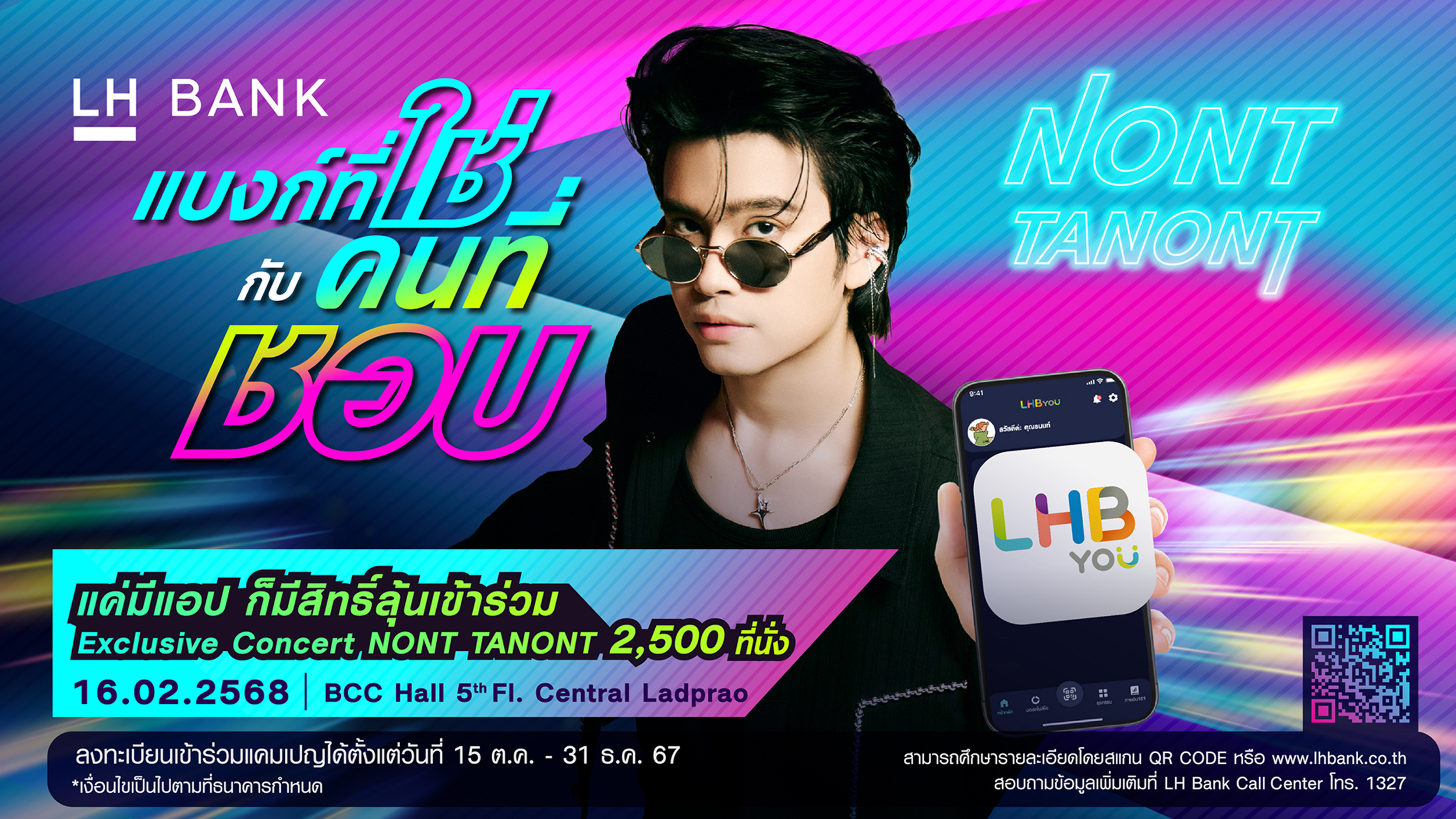 ธนาคารแลนด์ แอนด์ เฮ้าส์ จำกัด (มหาชน) หรือ LH Bank ตอกย้ำจุดยืนความเป็นไลฟ์สไตล์แบงก์กิ้งของแอปพลิเคชัน LHB You เติมเต็มประสบการณ์ด้าน Music Marketing จัดแคมเปญพิเศษ “LH Bank แบงก์ที่ใช่ กับคนที่ชอบ” เพียงมีแอปพลิเคชัน LHB You ก็มีสิทธิ์ลุ้นเข้าร่วม Exclusive Concert “LH Bank x NONT TANONT” ที่จัดขึ้นในวันอาทิตย์ที่ 16 กุมภาพันธ์ 2568 ณ BCC Hall เซ็นทรัล ลาดพร้าว ชั้น 5 ลูกค้าสามารถลงทะเบียนเพื่อเข้าร่วมแคมเปญได้ตั้งแต่วันที่ 15 ตุลาคม–31 ธันวาคม 2567 เท่านั้น