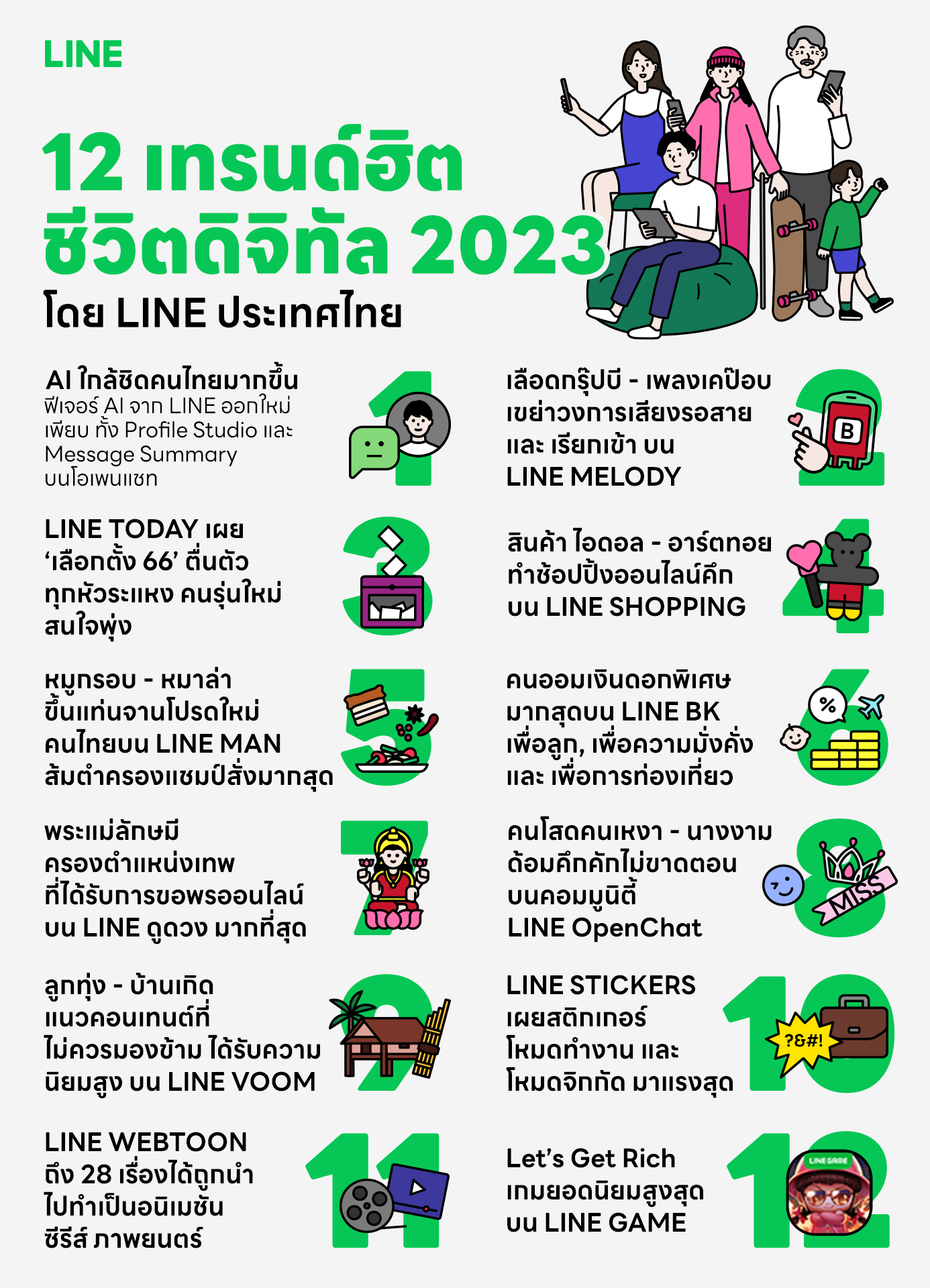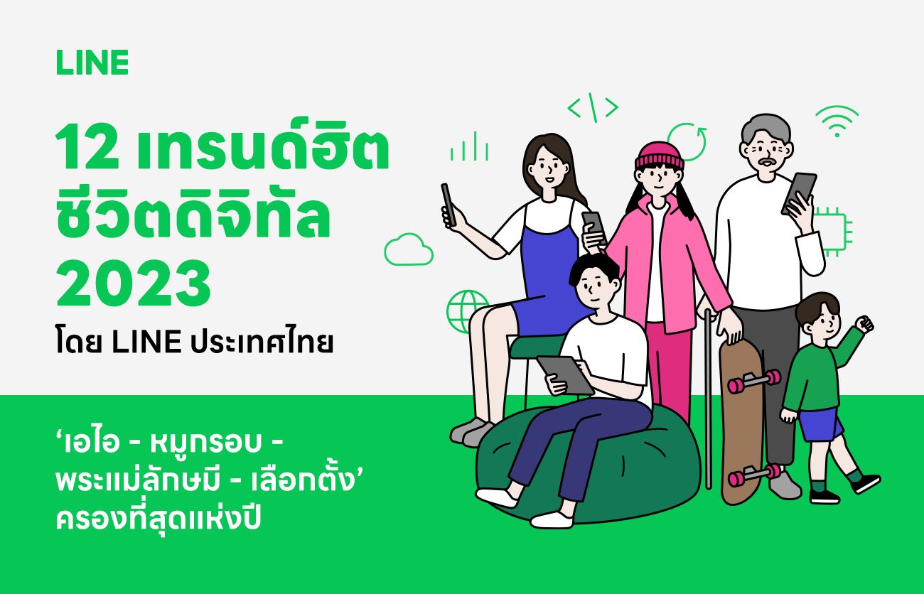 ปี 2023 มีเรื่องราวและความเปลี่ยนแปลงเกิดขึ้นมากมาย ทั้งในแง่ของกระแสสังคม เศรษฐกิจ การเมือง ไลฟ์สไตล์ บางอย่างดำเนินต่อเนื่องมาจากปีก่อนหน้า บางอย่างเกิดขึ้นเป็นเทรนด์ใหม่ LINE ประเทศไทยเลยขอสรุป 12 เทรนด์ฮิตชีวิตดิจิทัลประจำปี 2023 มาให้แบบครบจบในที่เดียว พบ “เอไอ – หมูกรอบ – พระแม่ลักษมี – เลือกตั้ง” ครองความนิยมสูงสุดในหมู่คนไทยผ่านบริการต่าง ๆ บนแอป LINE