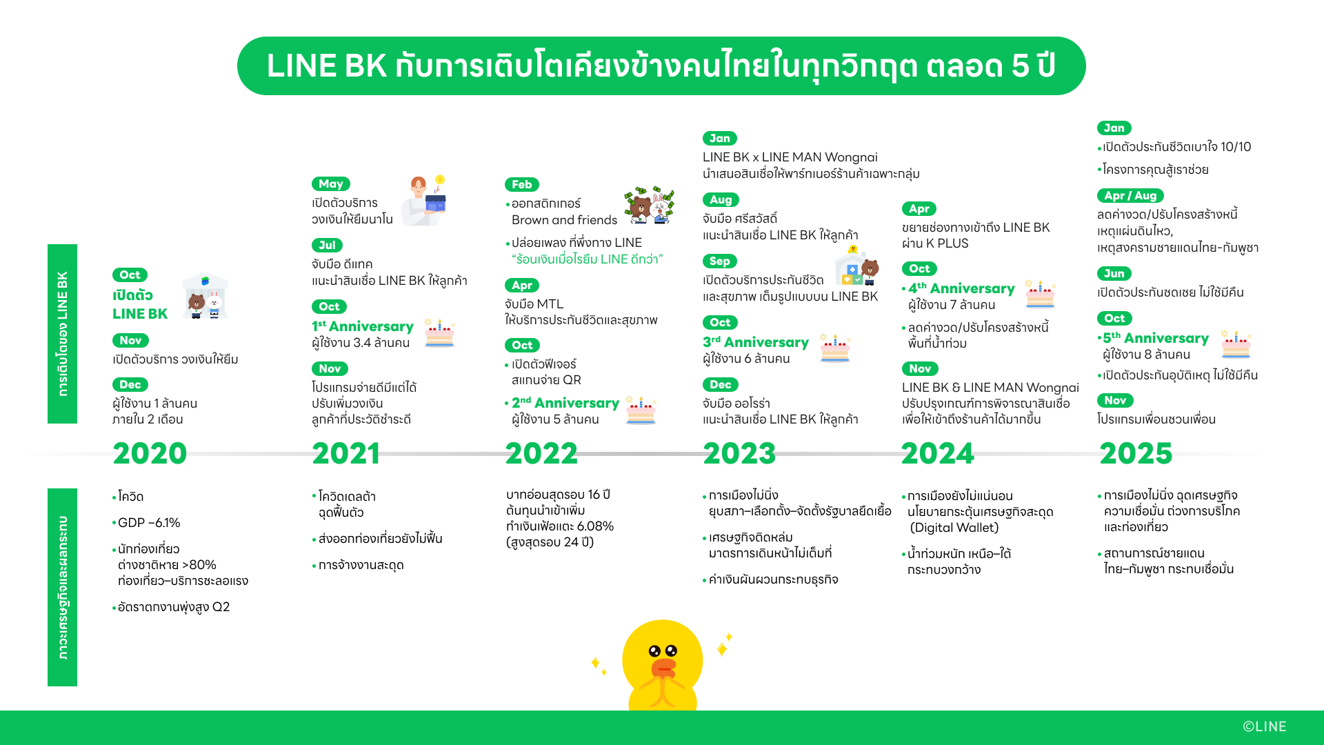 ตั้งแต่ LINE BK เปิดให้บริการวันแรก ซึ่งอยู่ในช่วงที่ประเทศไทยเผชิญทั้งวิกฤตโควิด-19 ความไม่แน่นอนทางเศรษฐกิจ การเมือง และค่าครองชีพ LINE BK ยืนหยัดเคียงคู่คนไทย ด้วยนโยบายและความช่วยเหลือที่ต้องการให้ลูกค้าผ่านพ้นวิกฤต และพลิกฟื้นกลับมาได้อย่างมั่นคง อาทิ