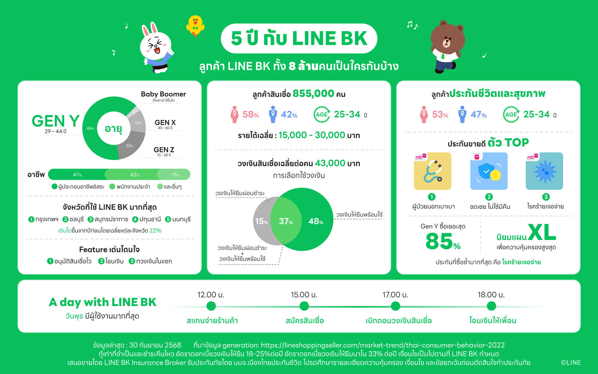 ปัจจุบันมีลูกค้าสินเชื่อกว่า 855,000 ราย โดยเกือบครึ่งของลูกค้าอาชีพอิสระที่สมัครสินเชื่อกับ LINE BK มีรายได้ต่ำกว่า 15,000 บาทต่อเดือน ซึ่งเป็นกลุ่มที่มักเผชิญข้อจำกัดในการเข้าถึงสินเชื่อดั้งเดิม ทั้งนี้ยังเตรียมเปิดตัวโปรแกรม “เพื่อนชวนเพื่อน” แนะนำสินเชื่อผ่านประสบการณ์ผู้ใช้จริง โดยผู้แนะนำจะได้รับเครดิตเงินคืนตามเงื่อนไข มีเป้าหมายเพื่อส่งเสริมการเข้าถึงแหล่งเงินทุนในระบบอย่างมีความรับผิดชอบ ลดการพึ่งพาหนี้นอกระบบ นอกจากนี้ LINE BK ยังร่วมมือกับ LINE MAN Wongnai เพื่อเปิดโอกาสให้ร้านค้าบนแพลตฟอร์มเข้าถึงเงินทุนได้สะดวกยิ่งขึ้นอีกด้วย