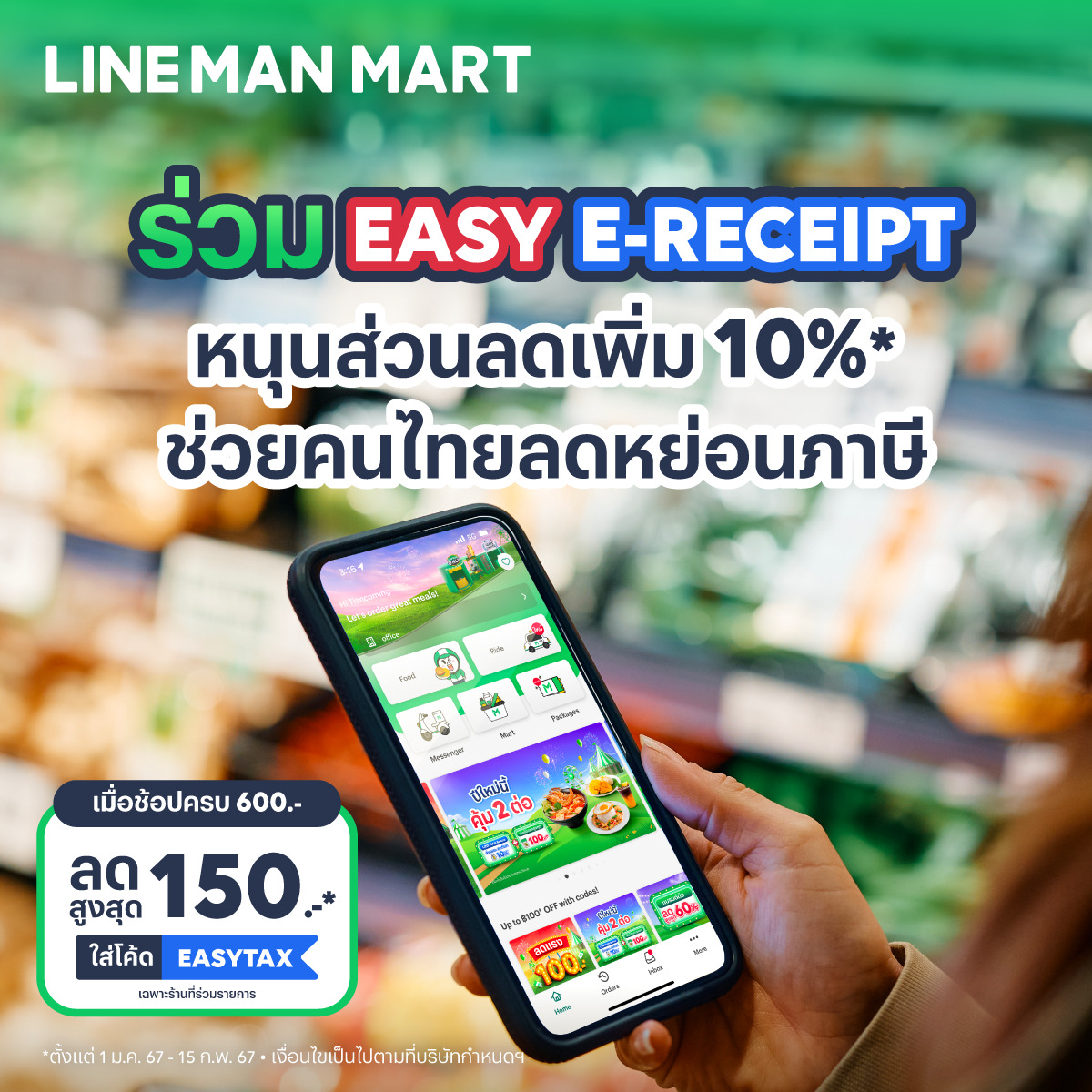 “โครงการ Easy E-Receipt” บน LINE MAN MART ถือเป็นก้าวสำคัญในการต่อยอดกระแสตอบรับที่ดีจากโครงการช้อปดีมีคืนลดหย่อนภาษีปี 2566 ที่ผ่านมา โดยการสนับสนุนโครงการภาครัฐครั้งนี้ เพื่อตอบโจทย์ไลฟ์สไตล์ของผู้บริโภคในยุคปัจจุบัน พร้อมอำนวยความสะดวกให้ผู้ใช้ไม่พลาดการได้รับสิทธิลดหย่อนภาษี นอกจากนี้ยังมอบส่วนลดพิเศษให้กับผู้ใช้เพียงกรอกโค้ด “EASYTAX” รับส่วนลด 10% สูงสุด 150 บาท เมื่อสั่งขั้นต่ำ 600 บาท**