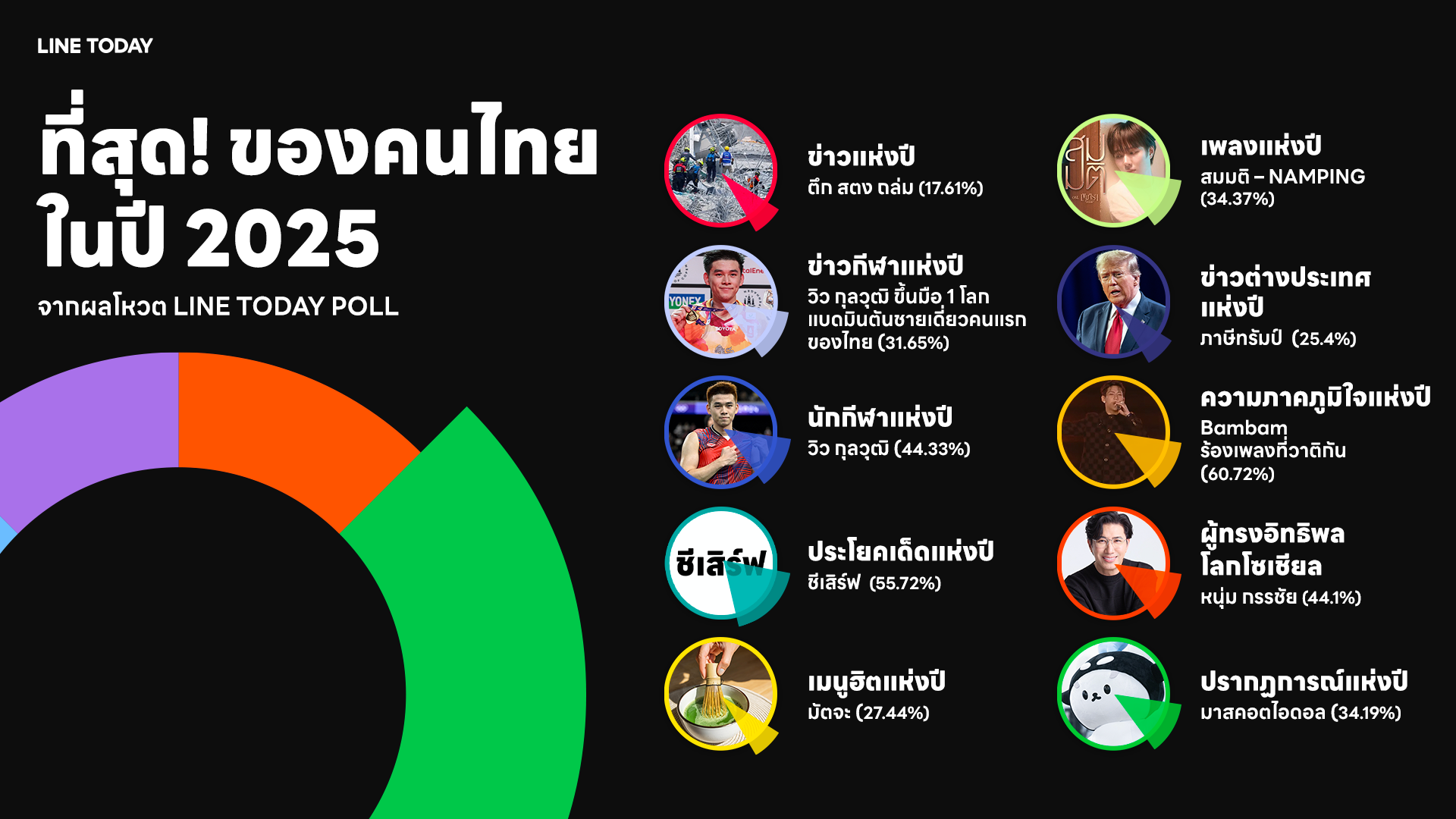 LINE TODAY เผยอินไซต์การเสพข่าวของคนไทยตลอดปี 2025 ผ่าน “A YEAR IN REVIEW 2025” รวบรวมทุกเหตุการณ์สำคัญที่สะท้อนภาพ “ปีแห่งความสั่นสะเทือน” ทั้งในระดับประเทศและระดับโลก จากภัยพิบัติ ความสูญเสีย ไปจนถึงความผันผวนทางเศรษฐกิจและการเมือง แต่ท่ามกลางวิกฤตก็ยังมีเรื่องราวในวงการบันเทิง กีฬา และศิลปวัฒนธรรมที่สร้างรอยยิ้มและแรงบันดาลใจให้คนไทยอีกครั้ง โดยตลอดทั้งปี LINE TODAY ยังคงทำหน้าที่เป็น “ศูนย์รวมทุกเรื่องราวแห่งปี” ที่บันทึกความเปลี่ยนผ่านของสังคมไทยไว้ครบทุกมิติ พร้อมจัดทำ LINE TODAY POLL OF THE YEAR 2025 โพลแห่งปี ที่เปิดเป็นสาธารณะให้มหาชนออนไลน์ ร่วมโหวต ในช่วงวันที่ 1-30 พฤศจิกายน 2568 ที่ผ่านมา ด้วยคะแนนโหวตรวมกว่า 1.2 ล้านคะแนน