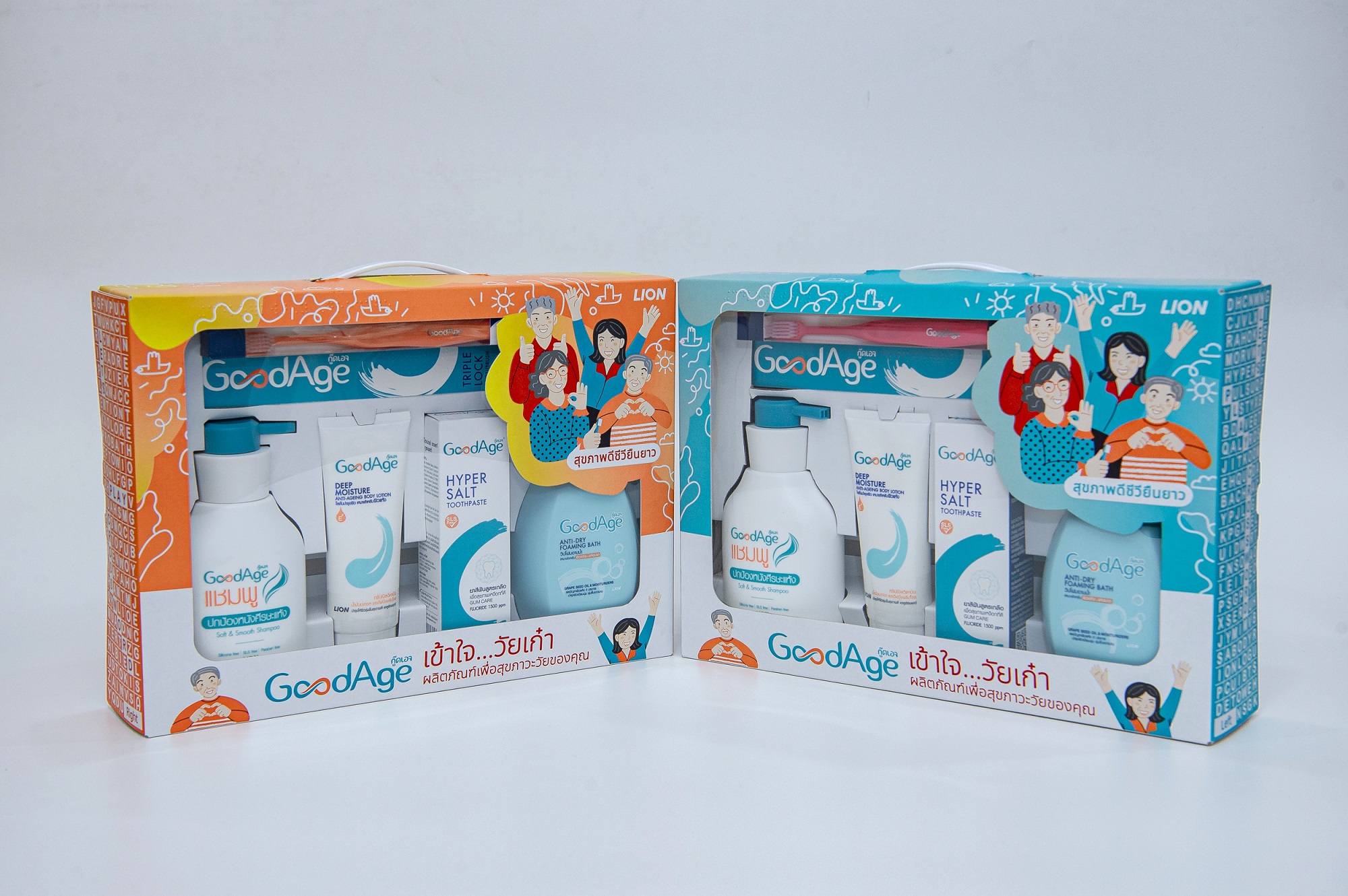 โดยในชุดของขวัญประกอบด้วย 5 ผลิตภัณฑ์ ดูแลครบจบในชุดเดียว ได้แก่ กู๊ดเอจ แอนติดราย โฟมมิ่งบาธ 450 มล. แชมพูสระผมกู๊ดเอจซอฟท์แอนท์สมูท 350 มล. กู๊ดเอจ ดีพมอยส์เจอร์แอนตี้เอจจิ้งโลชัน 100 มล. แปรงสีฟัน กู๊ดเอจ ทริปเปิ้ล ล๊อค เรคกูล่าร์ เฮด แคร์ ยาสีฟัน กู๊ดเอจ ไฮเปอร์ กลัม แคร์ ซอลท์ 90 มล. บรรจุอยู่ในกล่องสวยงาม ที่ออกแบบจากแรงบันดาลใจด้วยความรักความห่วงใยของครอบครัวที่มอบให้แก่กัน และมีความพิเศษโดยได้พิมพ์อักษรเบลล์ไว้ตรงมุมกล่องสำหรับผู้พิการทางสายตาอีกด้วย