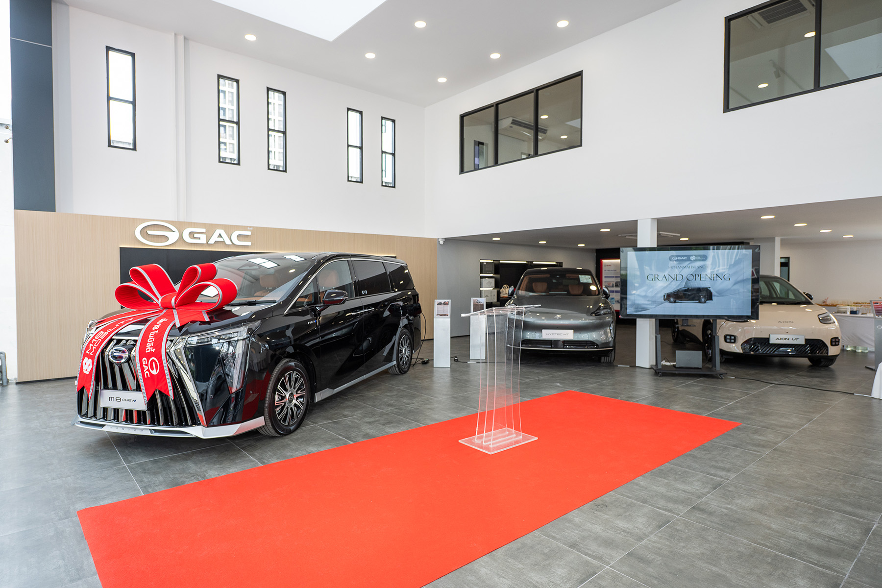 ไฮไลท์อีกอย่างสำหรับการเปิดโชว์รูมแห่งที่ 2 ของ M18 Mobility ก็คือการจัดแสดงรถยนต์เอนกประสงค์ GAC M8 PHEV เป็นครั้งแรกที่สาขาสะพานใหม่ โดยรถรุ่นนี้ถือเป็นเอ็มพีวีอัจฉริยะ ที่ผสมผสานสมรรถนะ เทคโนโลยีและความหรูหราเข้ากันอย่างลงตัว เพื่อตอบสนองความต้องการของผู้บริหารและตลาดครอบครัว ที่ต้องการรถที่มีความพร้อมสำหรับการใช้งานในชีวิตประจำวันอย่างครบครัน
