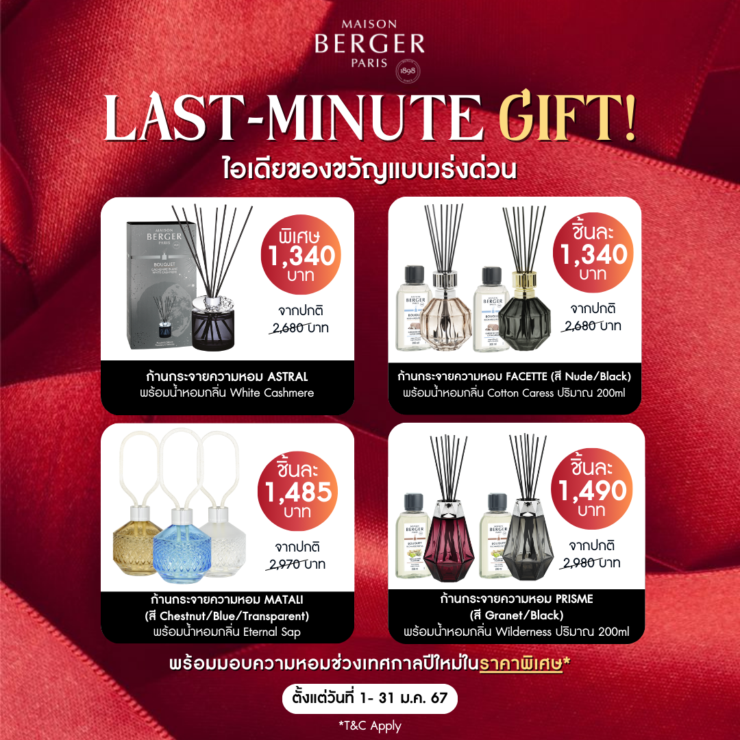 ก้านกระจายความหอม เมซอง แบร์เช่ ปารีส จัดราคาพิเศษให้ในช่วงเทศกาลแห่งความสุข ตั้งแต่วันนี้ – 31 มกราคม 2567 ได้แก่ คอลเลคชัน Astral พร้อมน้ำหอมกลิ่น White Cashmere ราคาพิเศษ 1,340 บาท (จากราคาปกติ 2,680 บาท) คอลเลคชัน Matali Crasset สี Chestnut สี Blue และสี Transparent พร้อมน้ำหอมกลิ่น Eternal Sap ราคาพิเศษ 1,485 บาท (จากราคาปกติ 2,970 บาท) คอลเลคชัน Prisme สี Garnet และสี Black พร้อมน้ำหอมกลิ่น Wilderness ราคาพิเศษ 1,490 บาท (จากราคาปกติ 2,980 บาท) และ คอลเลคชัน Facette สี Black และ สี Nude พร้อมน้ำหอมกลิ่น Cotton Caress ราคาพิเศษ 1,340 บาท (จากราคาปกติ 2,680 บาท) พบกับโปรโมชันพิเศษนี้ได้ทุกสาขา ยกเว้น เอ็มสเฟียร์ และ เซ็นทรัล ชิดลม
