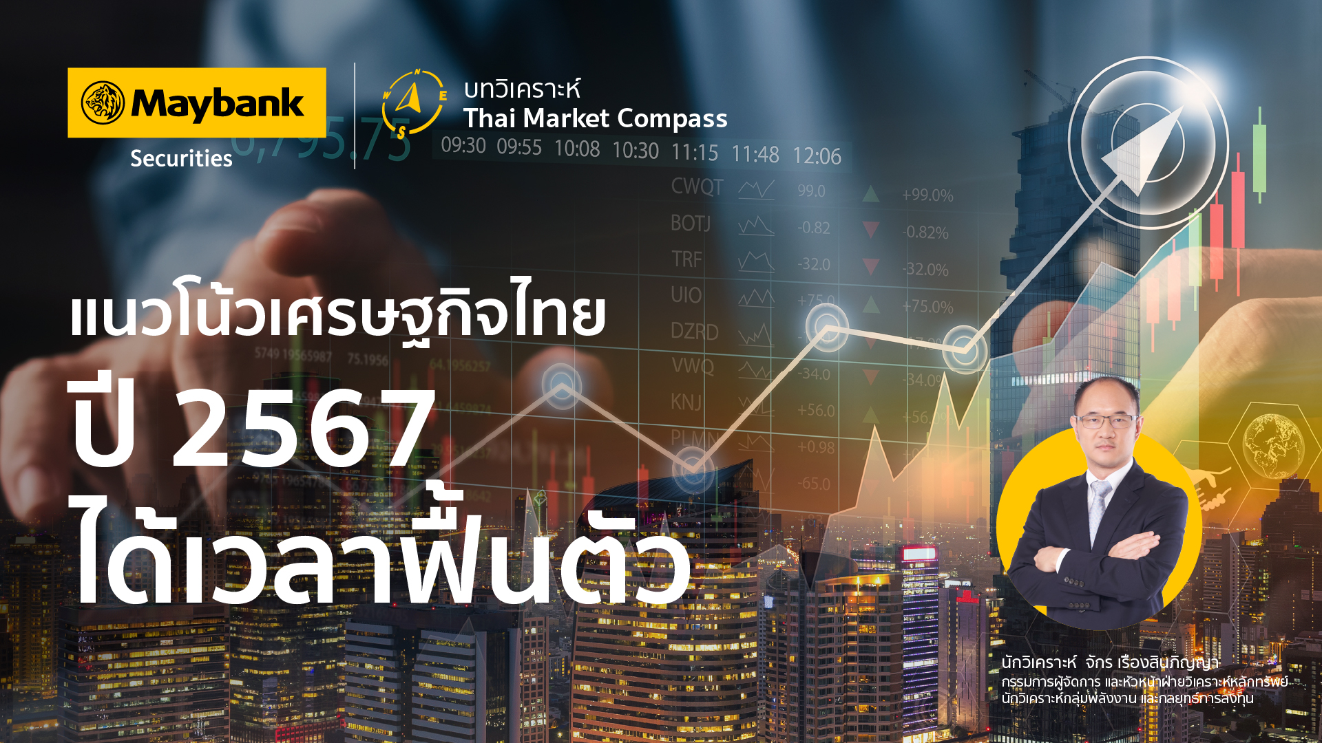 เมย์แบงก์ จัดทำบทวิเคราะห์ Thai Market Compass ในหัวข้อ “แนวโน้มปี 2567 ได้เวลาฟื้นตัว” โดยมองเป้าดัชนี SET Index ปีหน้าที่ 1640 จุด อิงจาก PER เฉลี่ย 10 ปีที่ 16.9 เท่าและ EPS67F ที่ 97 บาท/หุ้น กลับมาเติบโต 14%YoY ขณะที่ระดับ Valuation ซื้อขายบน PER67F ที่ 14 เท่าต่ำกว่าค่าเฉลี่ยระยะยาว -1 S.D. หรือมองในมุม Earning Yield Gap หรือส่วนต่างระหว่าง Earning Yield ของตลาดหุ้นเทียบกับอัตราผลตอบแทนพันธบัตรรัฐบาลระยะยาวอยู่ที่ 4.3% ซึ่งสูงกว่าค่าเฉลี่ยระยะยาวที่ 3.6% เกือบ 1SD ซึ่งถือเป็นระดับที่ไม่แพง แนะนำเพิ่มแนะนำลงทุน (Overweight) กลุ่มค้าปลีก ICT พลังงาน และลดน้ำหนักการลงทุน (underweight) ในกลุ่มปิโตรเคมีและการท่องเที่ยว (โรงแรม สนามบิน สายการบิน) โดยหุ้น Top Pick ชอบ KBANK EPG PTT GPSC TRUE BCP COM7 SABINA