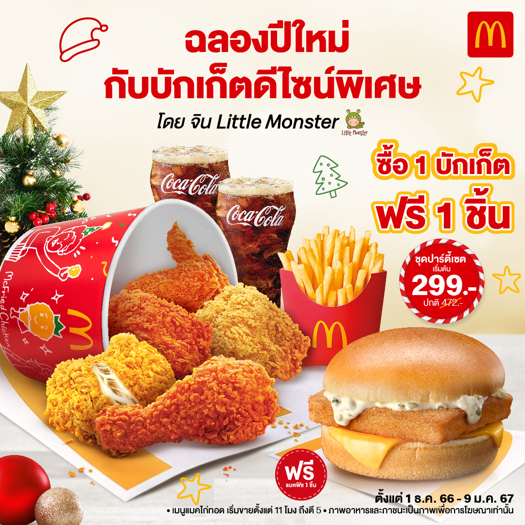 แมคโดนัลด์ ร่วมต้อนรับเทศกาลแห่งความสุขส่งท้ายปี ด้วยชุดปาร์ตี้เชตกับบักเก็ตดีไซน์พิเศษจาก ‘จิน Little Monster’ ด้วยลวดลายที่สร้างสรรค์ขึ้นจากแรงบันดาลใจที่อยากร่วมเป็นหนึ่งในรอยยิ้มและ ให้ครอบครัวได้อยู่ร่วมกันอย่างมีความสุขในช่วงส่งท้ายปี ชุดปาร์ตี้เชตสุดพิเศษนี้ พร้อมให้ทุกคนได้อิ่มคุ้ม อร่อยเต็มพิกัดกับเพื่อนๆ และครอบครัว ในราคาเริ่มต้นเพียง 299 บาท (จากราคาปกติ 472 บาท) อัดแน่นไปด้วยหลากหลายเมนูฮิต ได้แก่ แมคไก่ทอด 5 ชิ้น , เฟรนช์ฟรายส์ ขนาดกลาง 1 กล่อง , โค้ก ขนาด 16 ออนซ์ 2 แก้ว แถมฟรี! แมคฟิช 1 ชิ้น (มูลค่า 92 บาท) โดยรายได้ส่วนหนึ่งจากการจัดจำหน่าย หลังหักค่าใช้จ่าย จะนำไปมอบให้แก่มูลนิธิโรนัลด์ แมคโดนัลด์ เฮาส์ เพื่อร่วมสบทบทุนและแบ่งปันความสุขสู่โครงการบ้านพักพิงเพื่อครอบครัวผู้ป่วยเด็ก ภายใต้การดูแลของมูลนิธิฯ